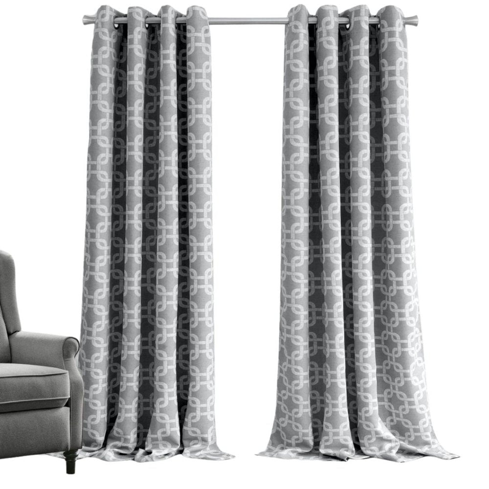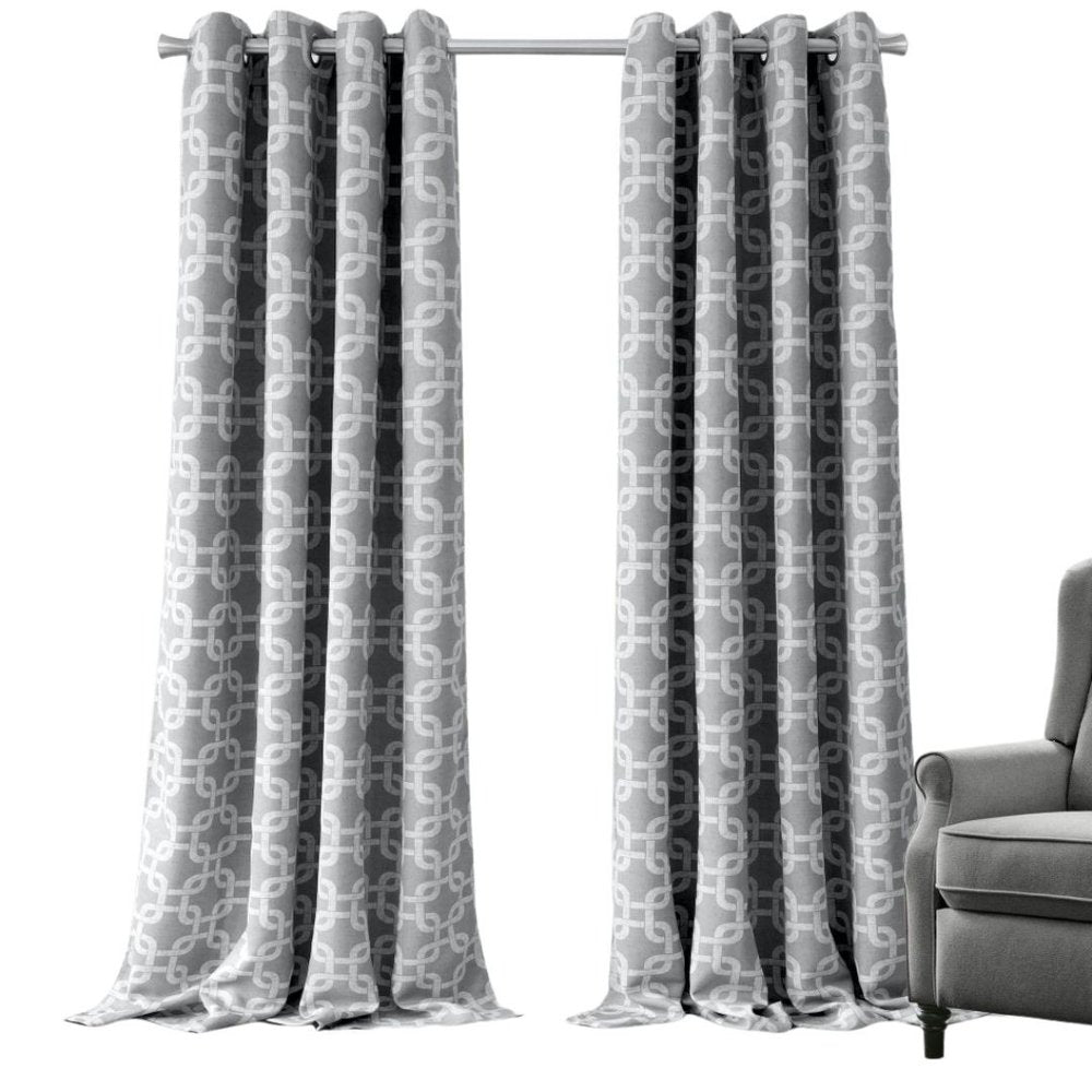 Enhance your windows with the 84” silver interlock pattern window curtain panel. This contemporary curtain panel is designed in a stunning silver and white color scheme, adding a touch of sophistication to your space. Made from high-quality polyester material, it ensures durability and easy maintenance. With its blackout light filtration, this single panel blocks out unwanted sunlight, providing you with a peaceful and serene ambiance. Measuring 54 inches in width and 84 inches in length, it is suitable for most standard-sized windows. Elevate the style of your home decor with this elegant curtain panel that effortlessly combines modern design and functionality. 84-inch H x 54-inch W x 1-inch D