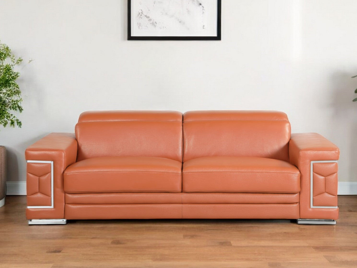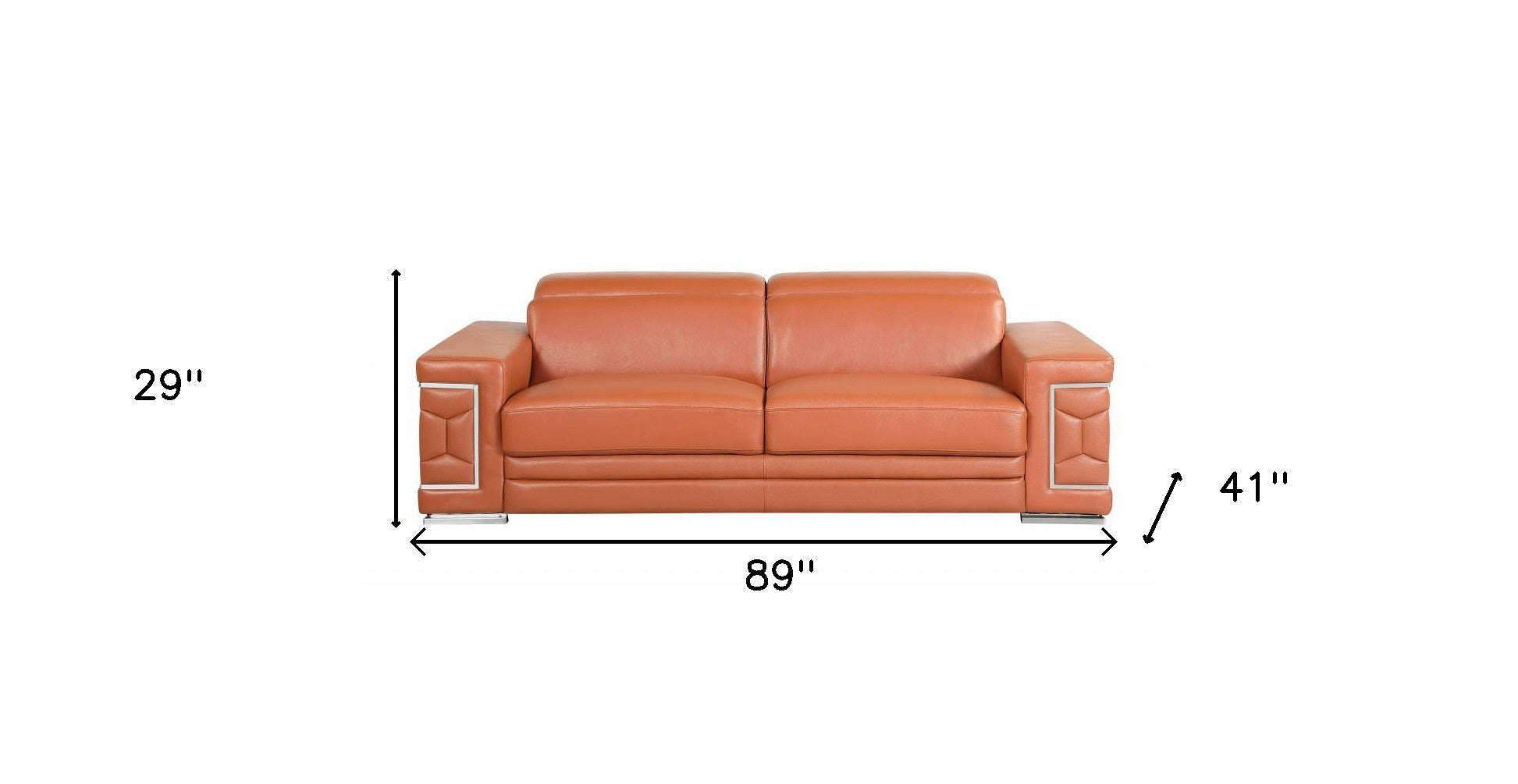Made of the highest quality, supple leather, this 89-inch camel Italian leather sofa with silver legs will be the star of your space. The high-grade premium leather used makes your lounging luxuriously comfortable and adds an elegant appeal to your space. Solid colors give you lots of decorative options and are easy to work into your decor scheme. Sinuous springs construction gives this piece strong support and makes it comfortable to sit even for long periods of time. Square arms offer a comfy place to rest. Silver stainless steel legs effortlessly elevate the room and add a touch of contemporary design. Built to last, this sofa will be a great centerpiece for your room. 29-inch H x 89-inch W x 41-inch D