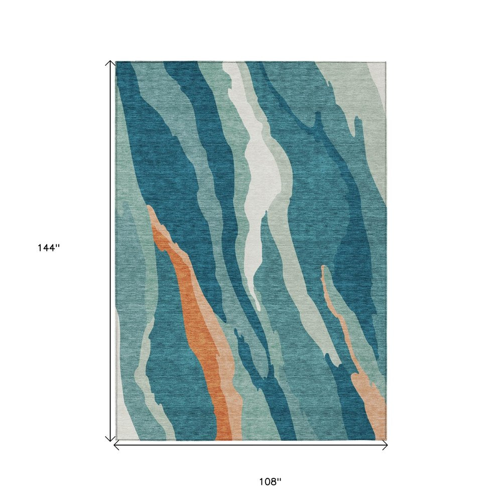 9' X 12' Teal Blue Copper And Ivory Abstract Washable Indoor Outdoor Area Rug