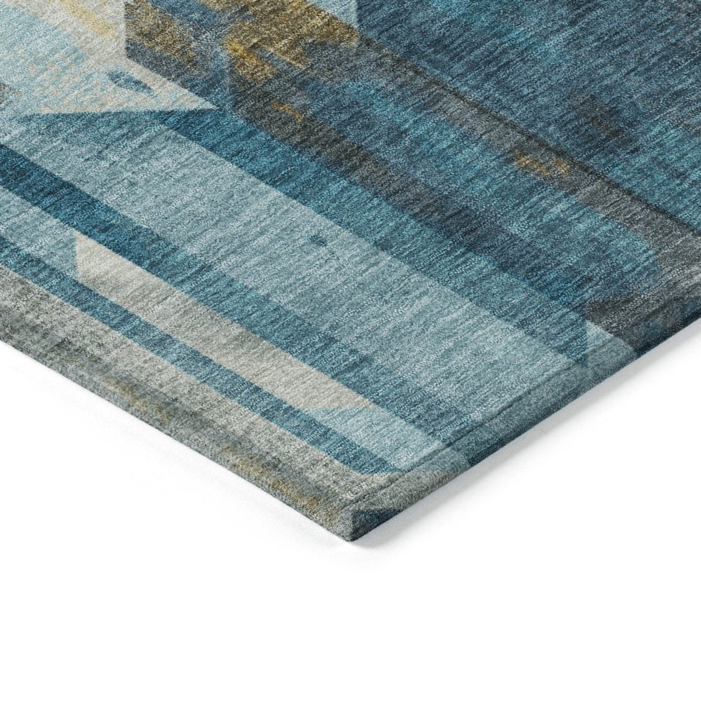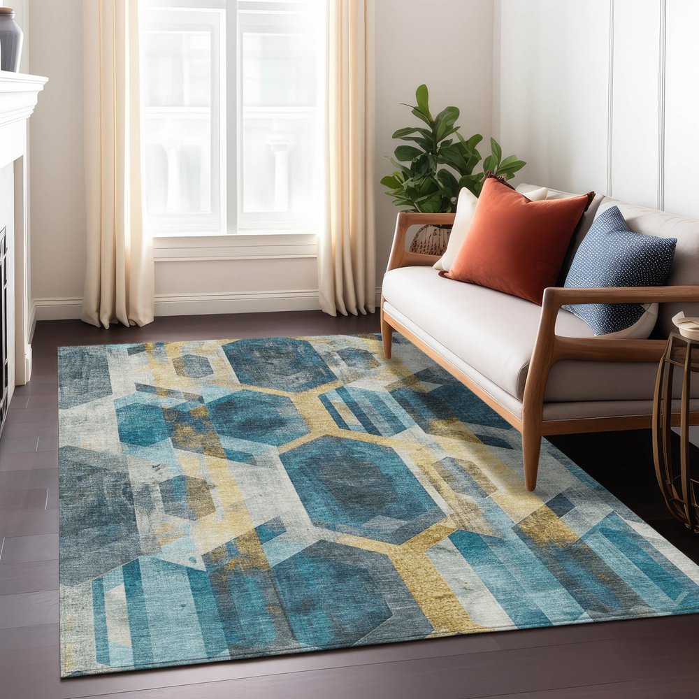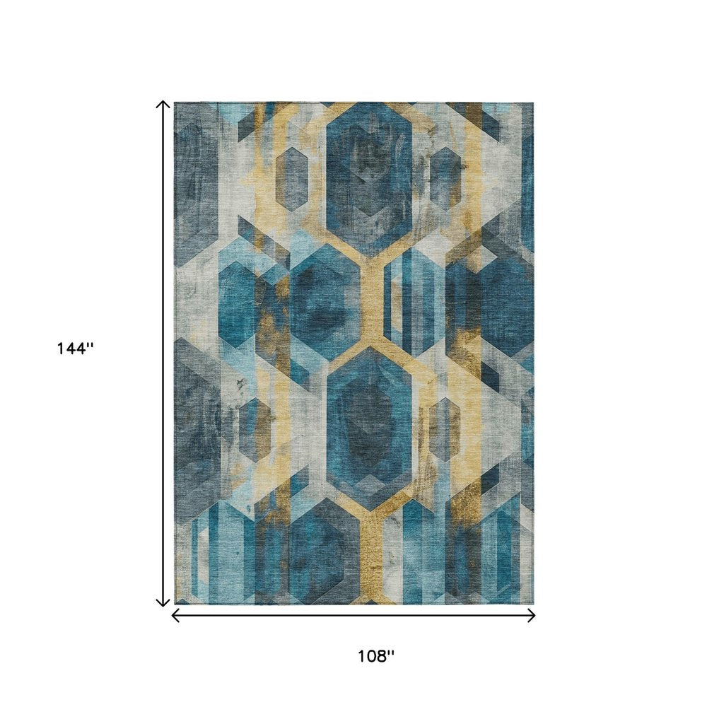 9' X 12' Teal Blue Gold And Silver Geometric Washable Indoor Outdoor Area Rug