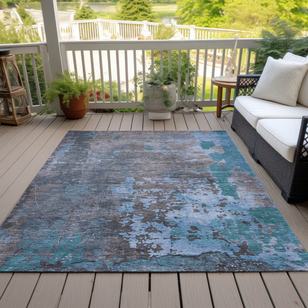 9' X 12' Teal Blue Taupe And Sky Blue Abstract Washable Indoor Outdoor Area Rug