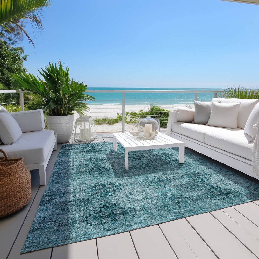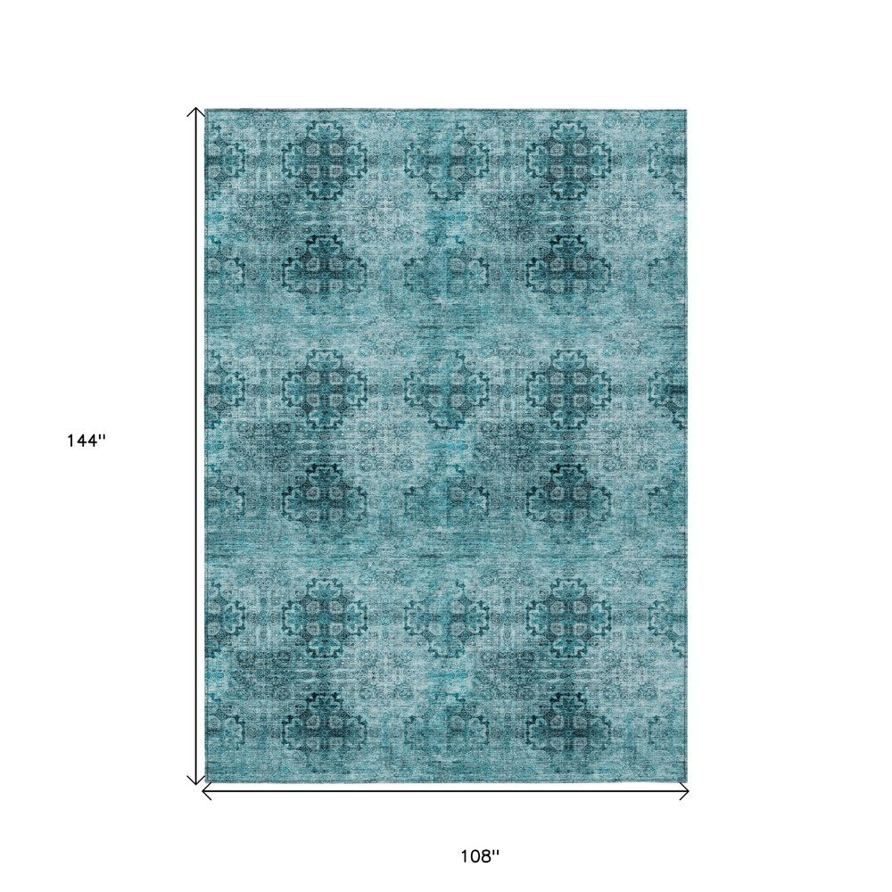 9' X 12' Teal Floral Medallion Washable Non Skid Indoor Outdoor Area Rug