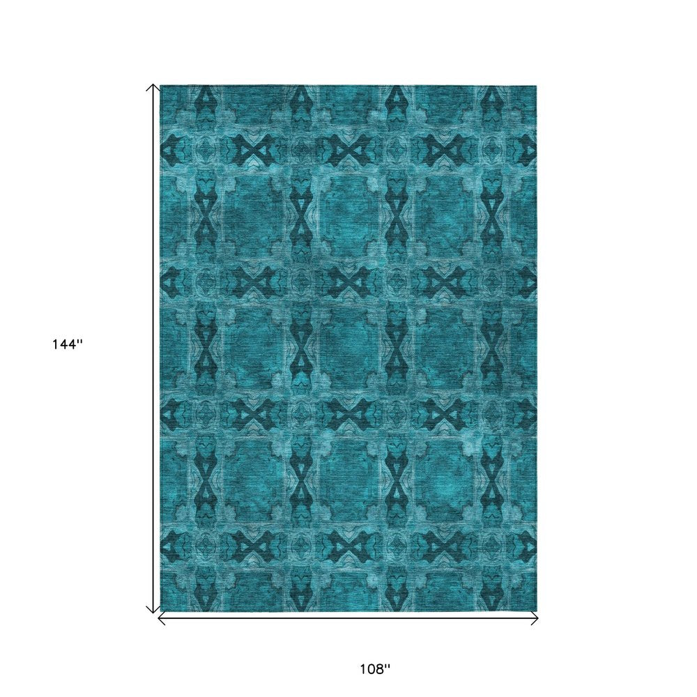 9' X 12' Teal Floral Medallion Washable Non Skid Indoor Outdoor Area Rug