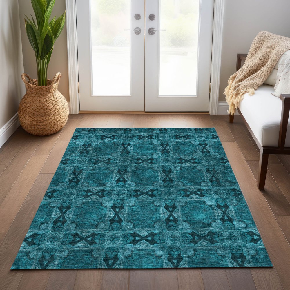 Set an inviting tone in your space with this 9-foot x 12-foot teal floral medallion washable stain resistant nonskid indoor outdoor area rug. This rectangle shaped rug features a floral medallion design in teal to give it visual interest. A classic shape marries with a good-looking design for your space ideal for spaces with kids and pets, this rug is stain resistant to help repel stains and spilled liquids. Place this area rug against a hardwood or tile floor and it will enliven your living space with style and sophistication. 108-inch H x 144-inch W x 0.19-inch D