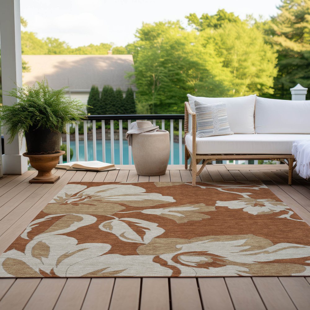 Set an inviting tone in your space with this 9-foot x 12-foot terra cotta and beige floral washable indoor outdoor area rug. This rectangle shaped rug features a floral design that will work well both indoors or out. A classic shape marries with good looking design for your living room, hall, bedroom, porch, patio, or poolside. Ideal for outdoor spaces or high traffic areas with kids and pets, this rug is made from heavy duty polyester that is stain resistant to help repel water, dirt, and stains. Makes a great way to dress up your patio, porch, or poolside, but also works well as a durable and easy to maintain option in the kitchen, family room, or mudroom. 108-inch h x 144-inch w x 0.19-inch d.