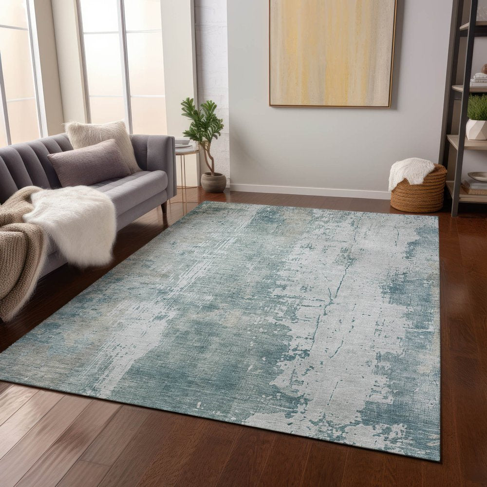This 9-foot x 12-foot turquoise and ivory abstract washable indoor outdoor area rug, is a great way to add warmth to a room. This rectangle shaped rug features a abstract design that will work well both indoors or out. A classic shape marries with good looking design for your living room, hall, bedroom, porch, patio, or poolside. Ideal for outdoor spaces or high traffic areas with kids and pets, this rug is made from heavy duty polyester that is stain resistant to help repel water, dirt, and stains. Makes a great way to dress up your patio, porch, or poolside, but also works well as a durable and easy to maintain option in the kitchen, family room, or mudroom. 108-inch h x 144-inch w x 0.19-inch d.