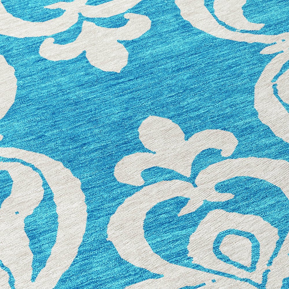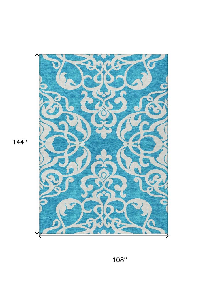 9' X 12' Turquoise And Ivory Damask Washable Indoor Outdoor Area Rug