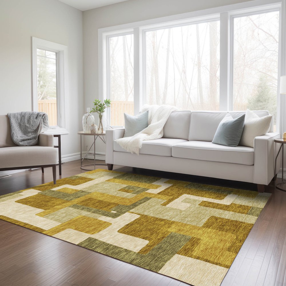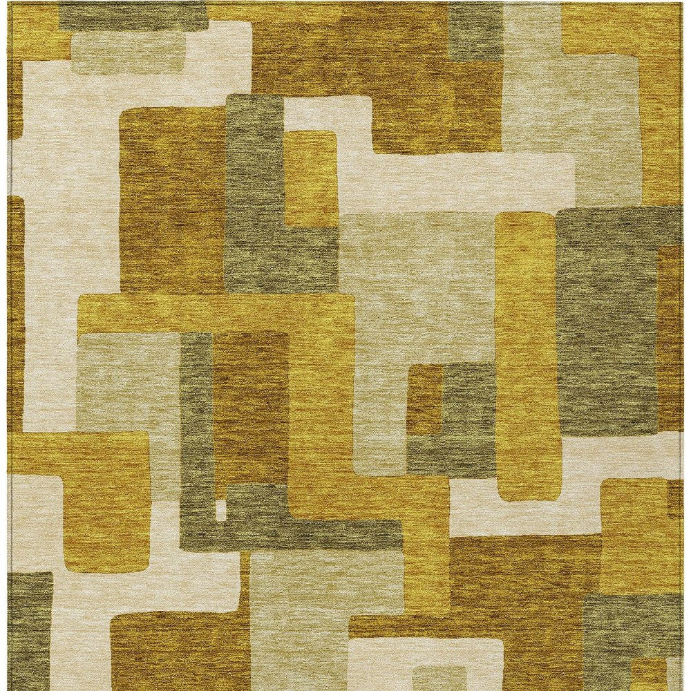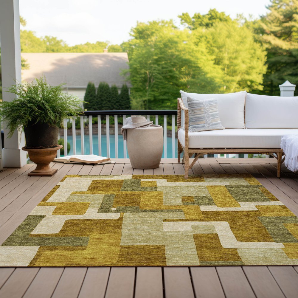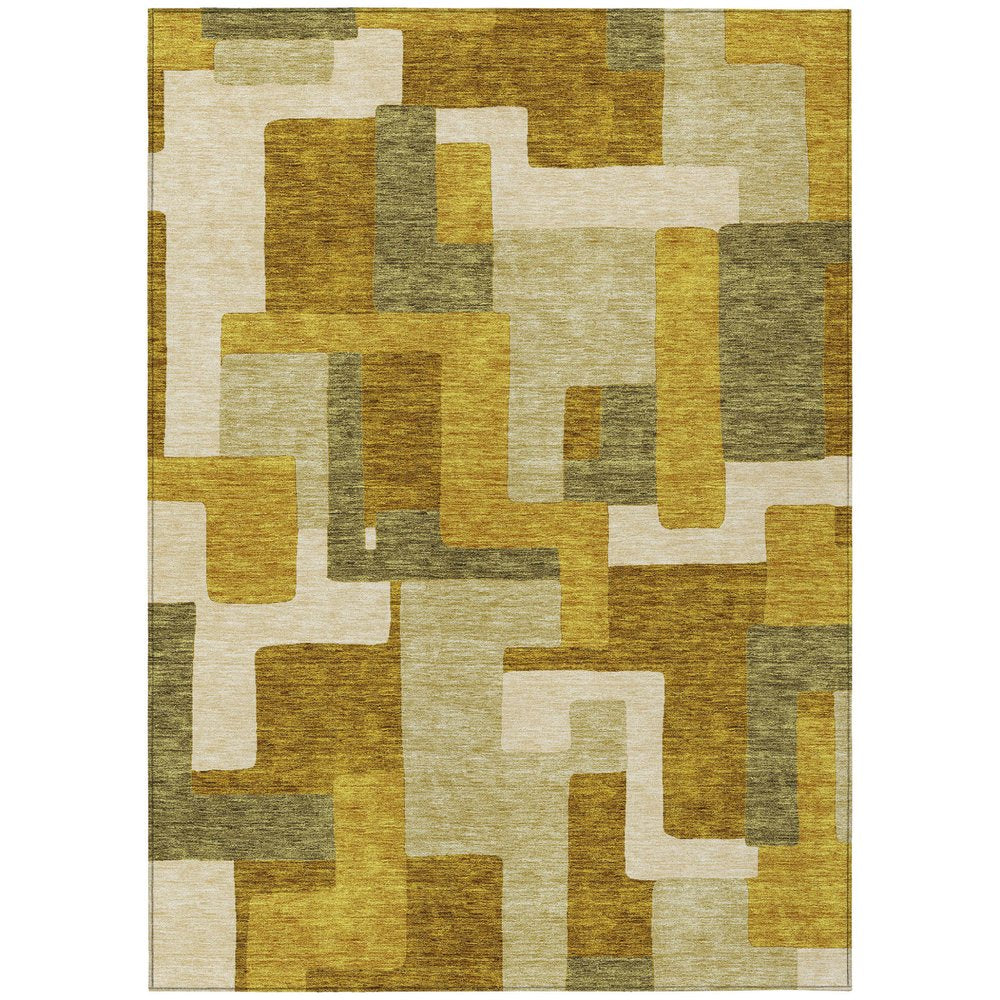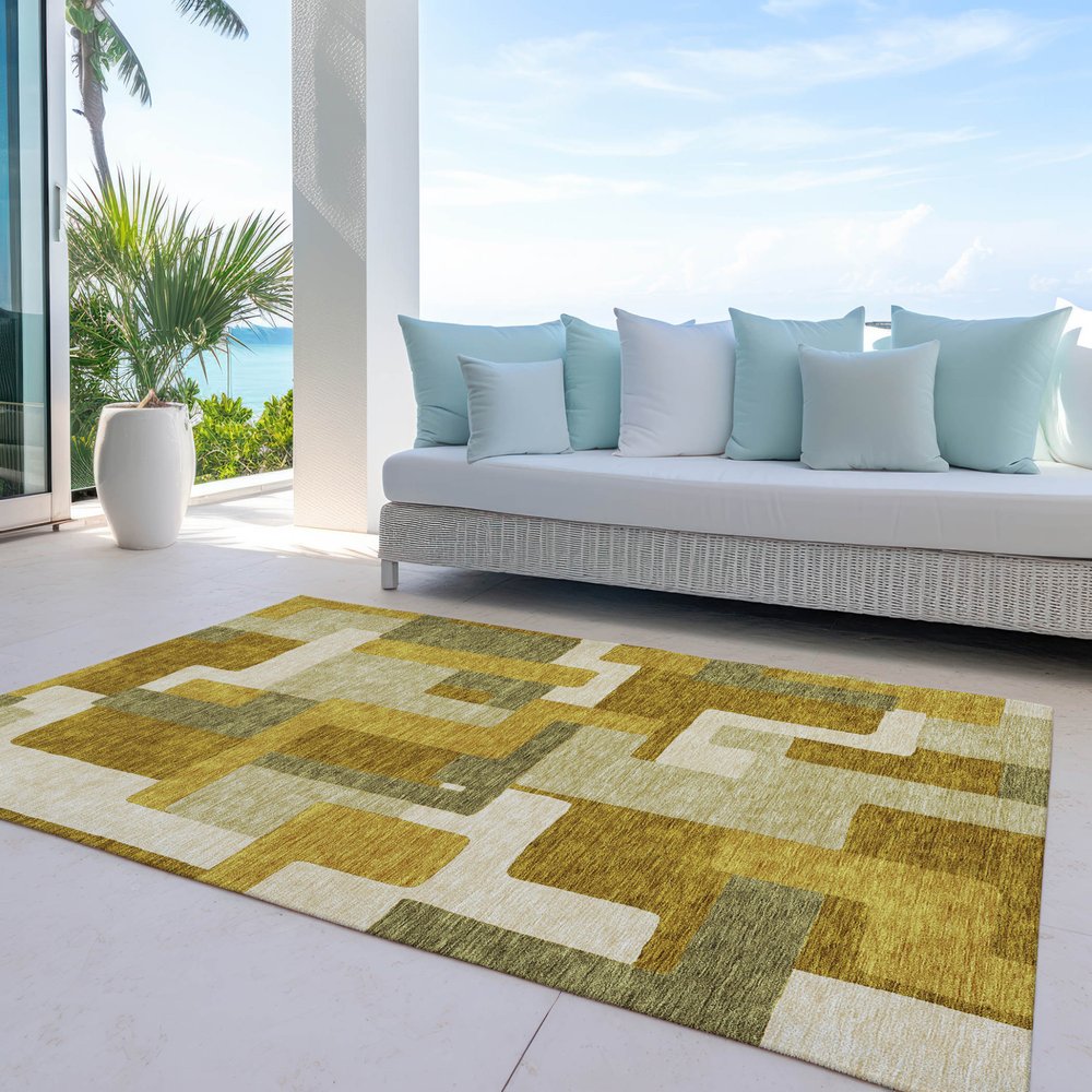 Add some artistry to your room with this 9-foot x 12-foot wheat ivory and gold geometric washable indoor outdoor area rug. This rectangle shaped rug features a geometric design that will work well both indoors or out. A classic shape marries with good looking design for your living room, hall, bedroom, porch, patio, or poolside. Ideal for outdoor spaces or high traffic areas with kids and pets, this rug is made from heavy duty polyester that is stain resistant to help repel water, dirt, and stains. Versatile in use, durable, and easy to maintain, this rug is an ideal solution to add a decorative and inviting touch to your indoor or outdoor space. 108-inch h x 144-inch w x 0.19-inch d.