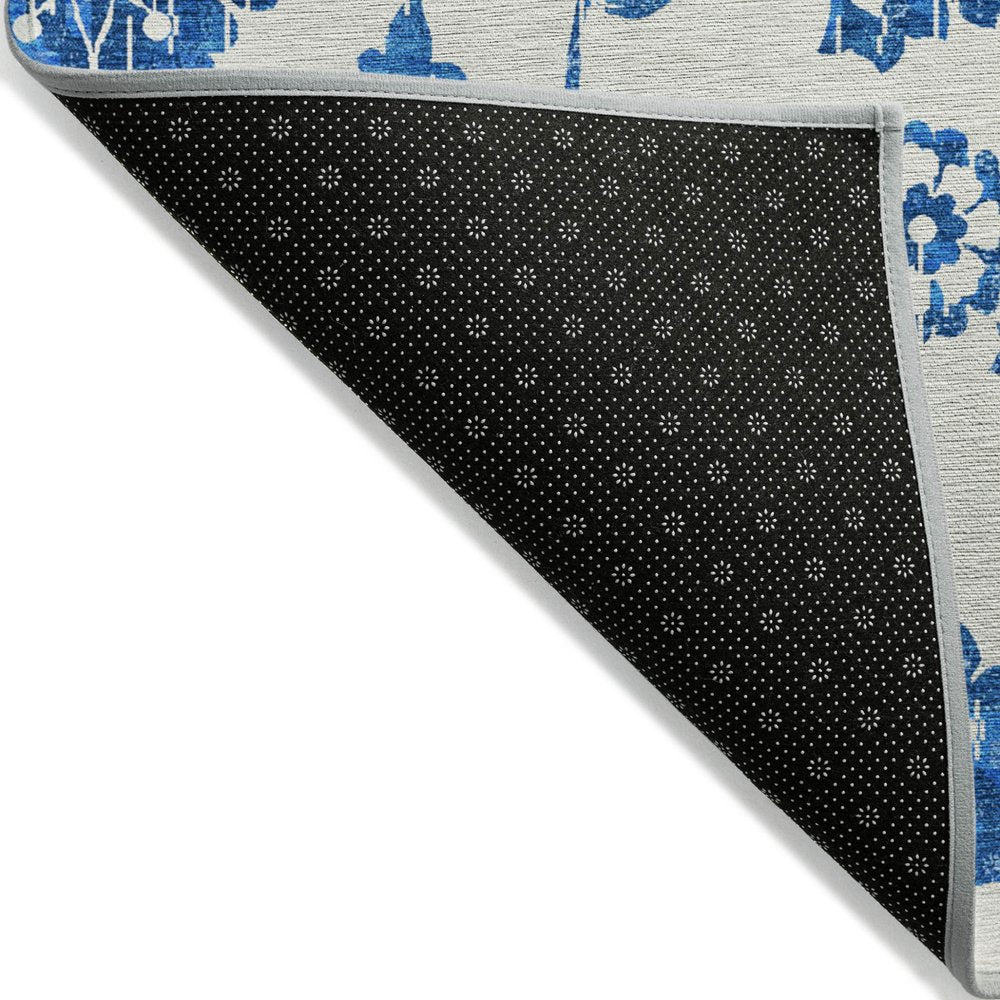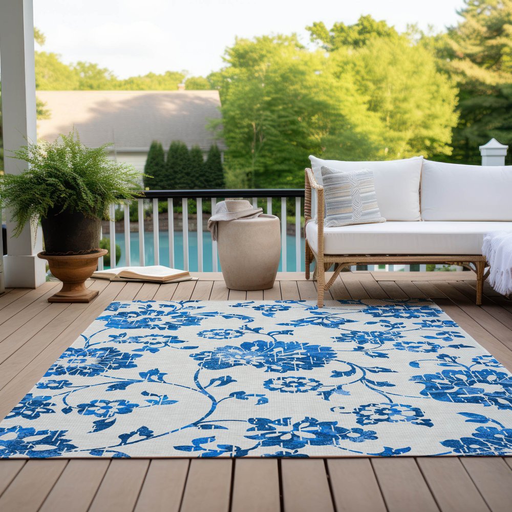 9' X 12' White And Denim Blue Floral Washable Indoor Outdoor Area Rug