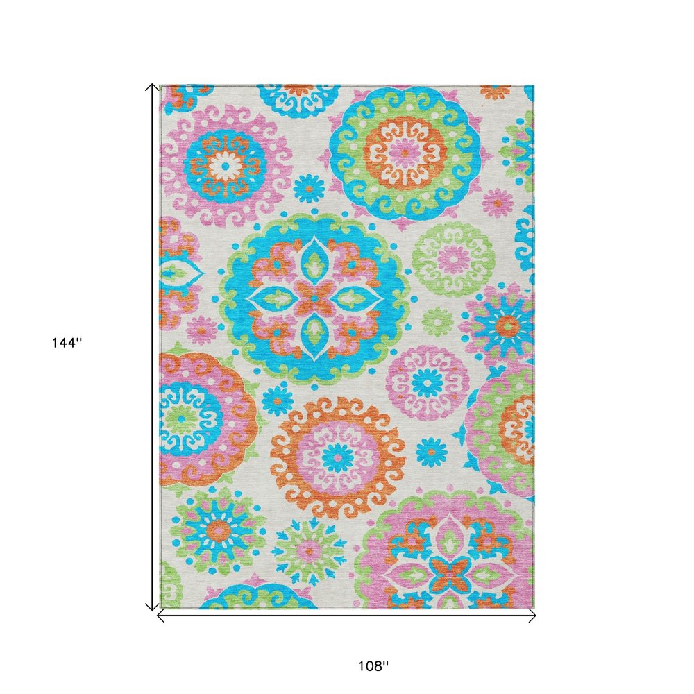 9' X 12' White Orange And Teal Blue Floral Medallion Washable Indoor Outdoor Area Rug