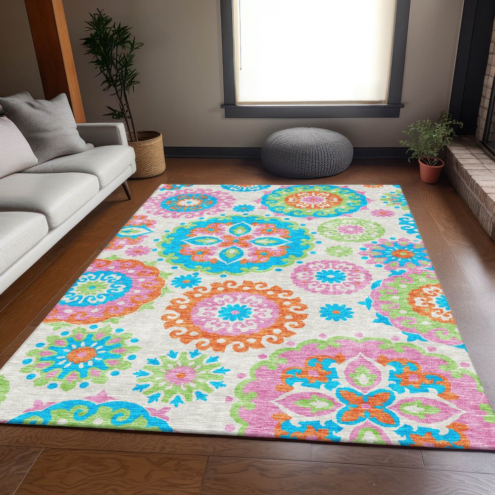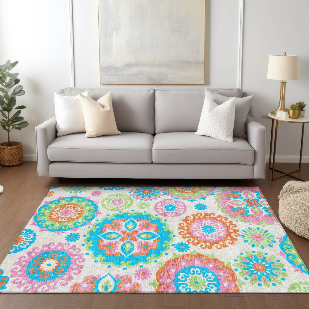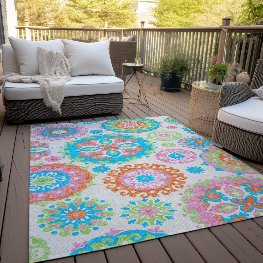 Add some artistry to your room with this 9-foot x 12-foot white orange and teal blue floral medallion washable indoor outdoor area rug. This rectangle shaped rug features a floral medallion design that will work well both indoors or out. A classic shape marries with good looking design for your living room, hall, bedroom, porch, patio, or poolside. Ideal for outdoor spaces or high traffic areas with kids and pets, this rug is made from heavy duty polyester that is stain resistant to help repel water, dirt, and stains. Versatile in use, durable, and easy to maintain, this rug is an ideal solution to add a decorative and inviting touch to your indoor or outdoor space. 108-inch h x 144-inch w x 0.19-inch d.