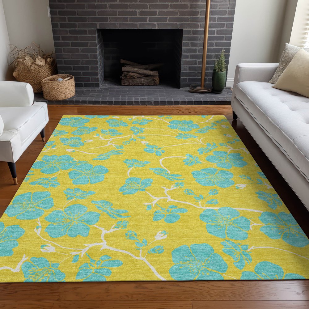 9' X 12' Yellow And Aqua Floral Washable Indoor Outdoor Area Rug