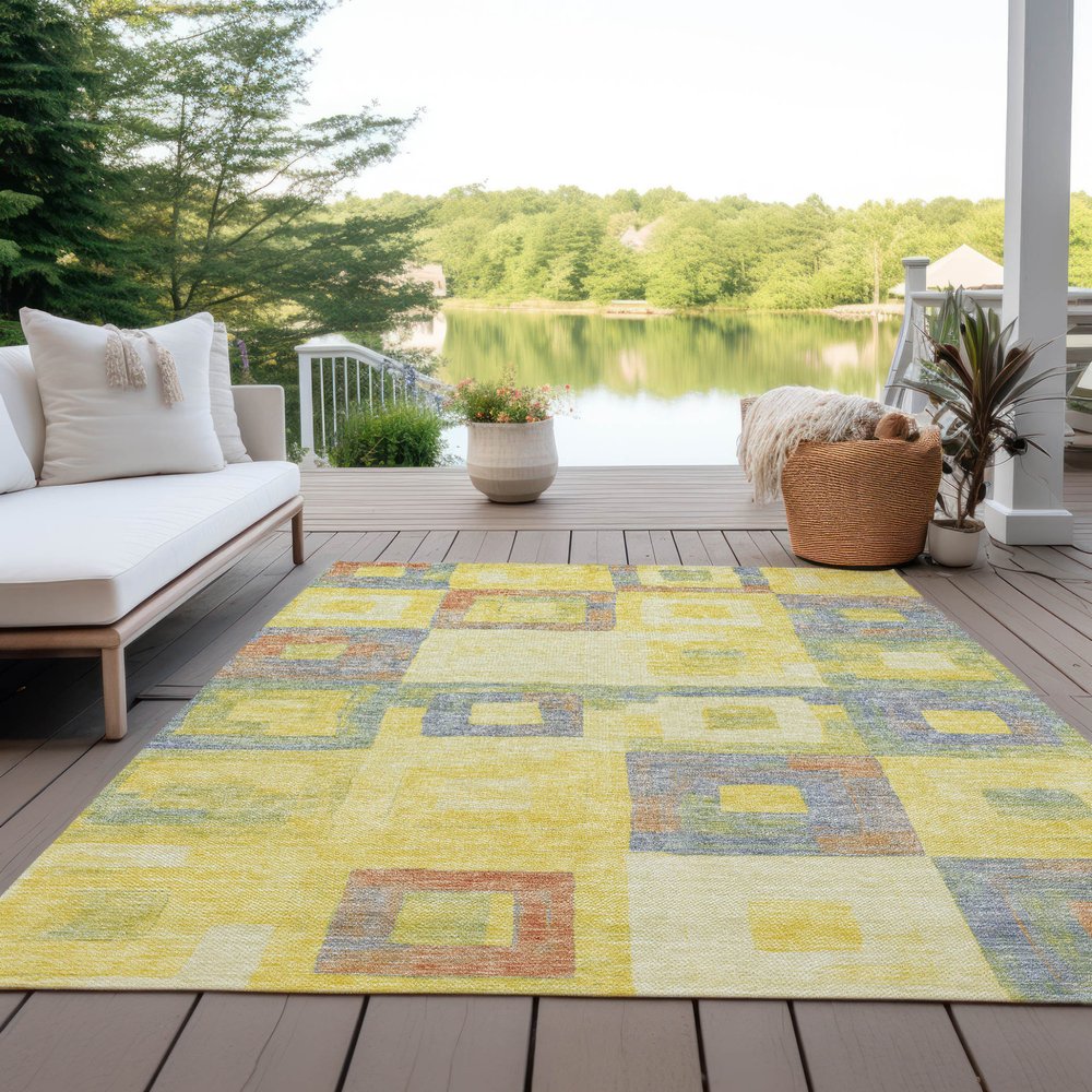 Set an inviting tone in your space with this 9-foot x 12-foot yellow blue and terra cotta geometric washable indoor outdoor area rug. This rectangle shaped rug features a geometric design that will work well both indoors or out. A classic shape marries with good looking design for your living room, hall, bedroom, porch, patio, or poolside. Ideal for outdoor spaces or high traffic areas with kids and pets, this rug is made from heavy duty polyester that is stain resistant to help repel water, dirt, and stains. Makes a great way to dress up your patio, porch, or poolside, but also works well as a durable and easy to maintain option in the kitchen, family room, or mudroom. 108-inch h x 144-inch w x 0.19-inch d.