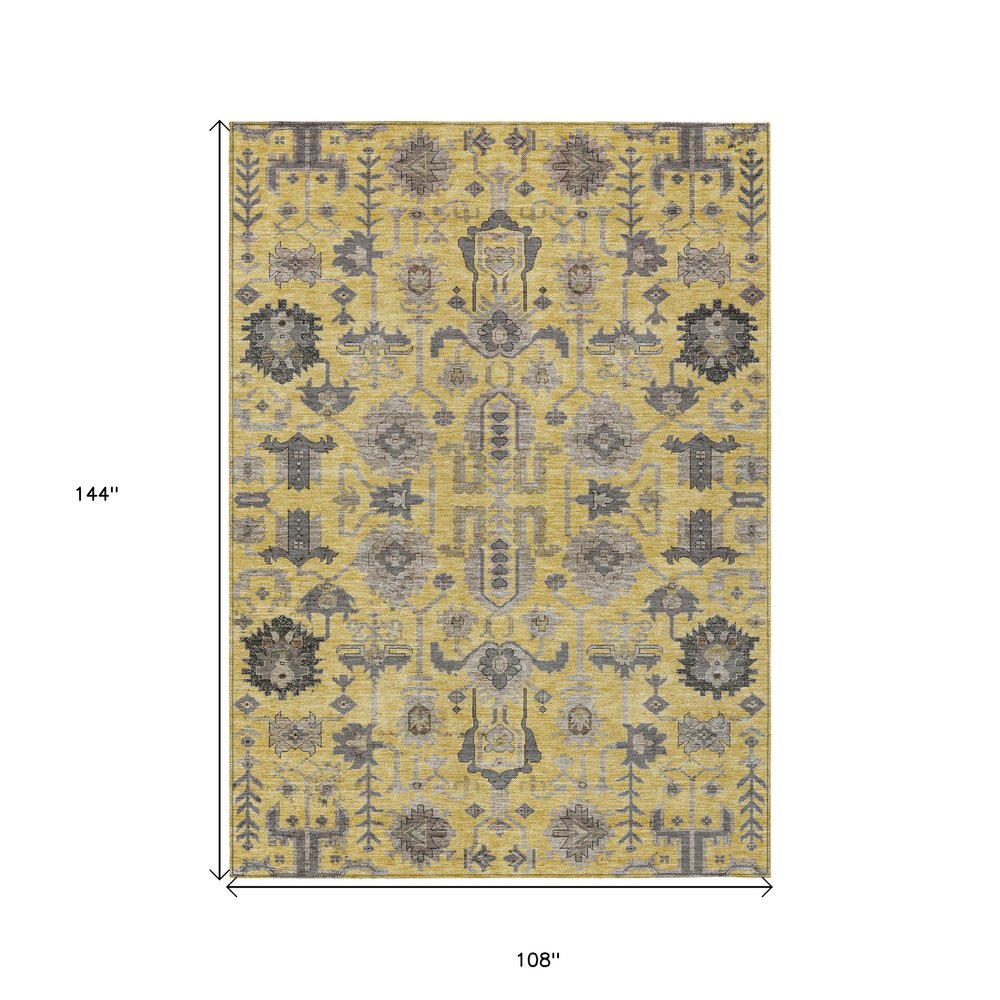 9' X 12' Yellow Gray And Charcoal Oriental Washable Indoor Outdoor Area Rug
