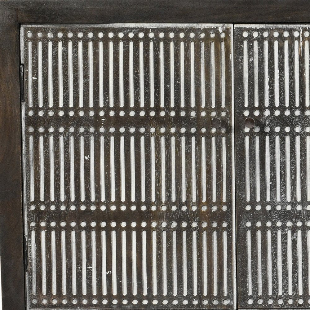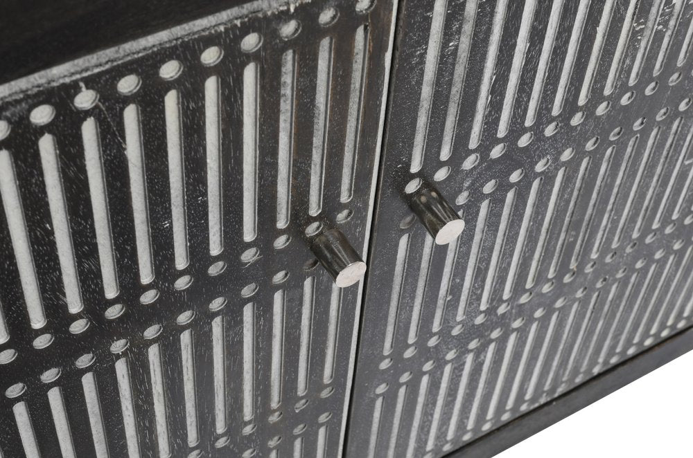 Ready to be enjoyed in your living room, family room, bedroom, office, or dining room, this 92-inch dark brown carved geometric distressed solid wood enclosed, and open storage TV stand is a practical and good-looking piece of furniture that will help to anchor your space. Designed to be sturdy and long lasting, this versatile furniture piece is handcrafted and features hand-carving from durable solid wood and features a modern rustic style that is purposefully heavily distressed. This large, designer chic media center is a great option to give your room dimension and visual presence. To add to the versatility, this piece features open non-concealed storage that can be used for not only storage but display as well. 30-inch h x 92-inch w x 16-inch d.