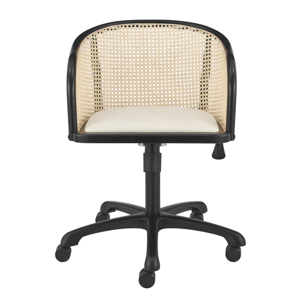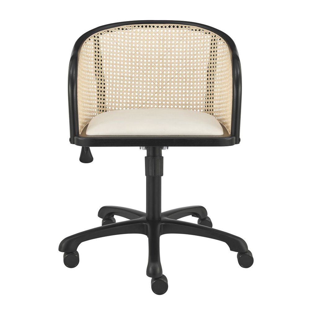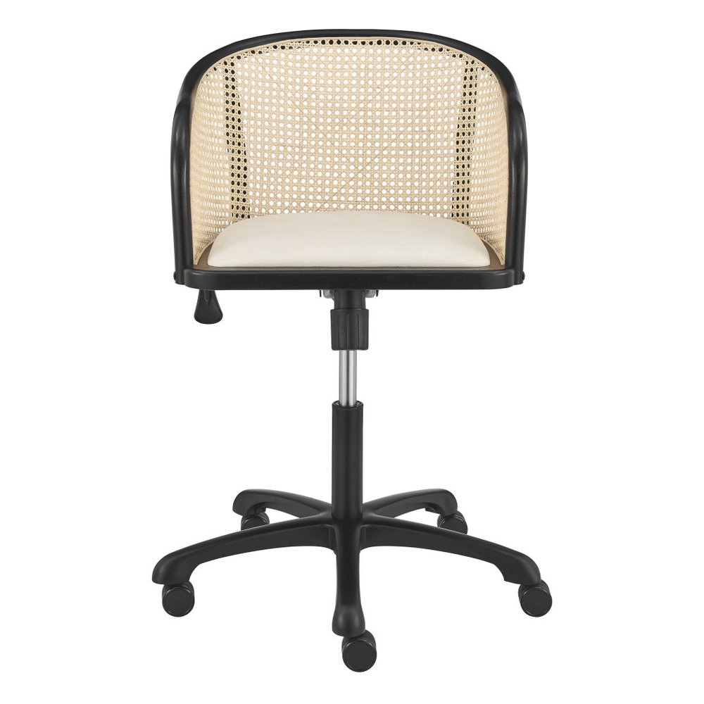 This beige and black solid wood steel and cane rattan adjustable swivel rolling office chair is a top performer when it comes to style and support. Comfort and functionality combine in this unique and stylish desk chair, complete with a black solid birch wood frame and inlaid cane rattan detailing that that instantly elevates your office space. Cultivate a healthier posture this chair that lets you instantly fine-tune the height of your seat and back as needed, so you can minimize slouching and posture-related ailments such as neck/shoulder strains and backaches. Furnish your office or home office in comfort and style with this high-quality office chair. 33.5-inch h x 22.5-inch w x 26.5-inch d.