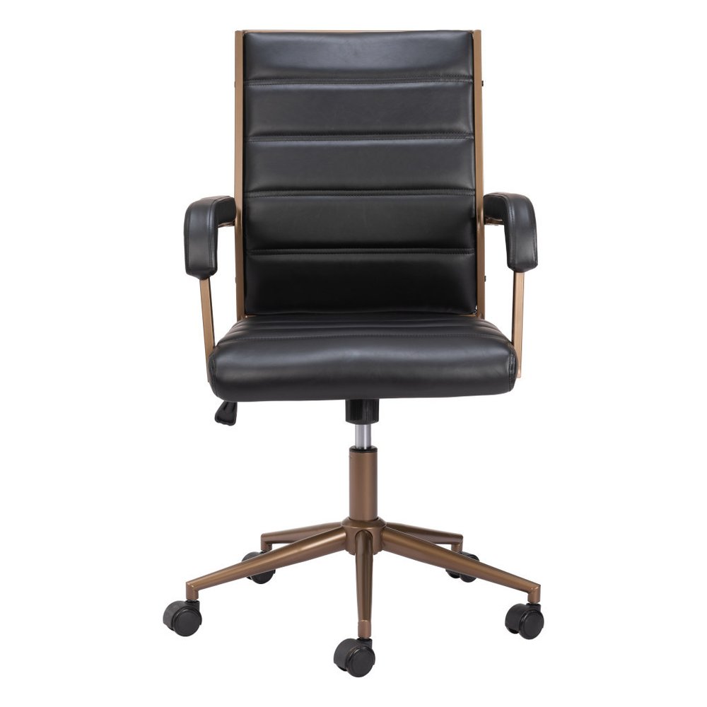 Far from just a perch when studying or working, this stylish black and bronze adjustable height faux leather swivel rolling office chair brings style and function to your workspace. The high-quality steel frame and construction and add durability, strength and support to the design. Comfortable and stylish, the durable faux leather channel tufted back, and overall chair aesthetic changes the dynamic of the room for the better. The seat is height adjustable, so you can customize it how you like. Furnish your office or home office in comfort and style with this high-quality office chair. 41.3-inch h x 25-inch w x 27-inch d.
