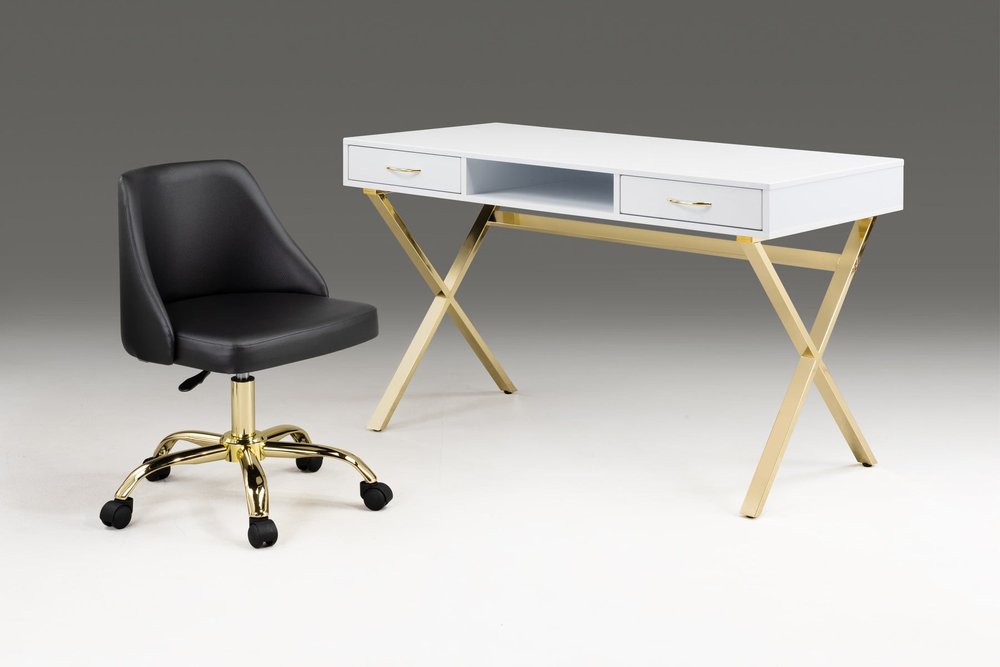 This black and gold adjustable height swivel rolling office chair is a top performer when it comes to style and support. The high-quality steel frame and construction and add durability, strength and support to the design. Comfortable and stylish, the durable faux leather back and overall chair aesthetic changes the dynamic of the room for the better. Cultivate a healthier posture this chair that lets you instantly fine-tune the height of your seat according to the height of your table, so you can minimize slouching and posture-related ailments such as neck/shoulder strains and backaches. Furnish your office or home office in comfort and style with this high-quality office chair. 29.3-inch h x 22-inch w x 22-inch d.
