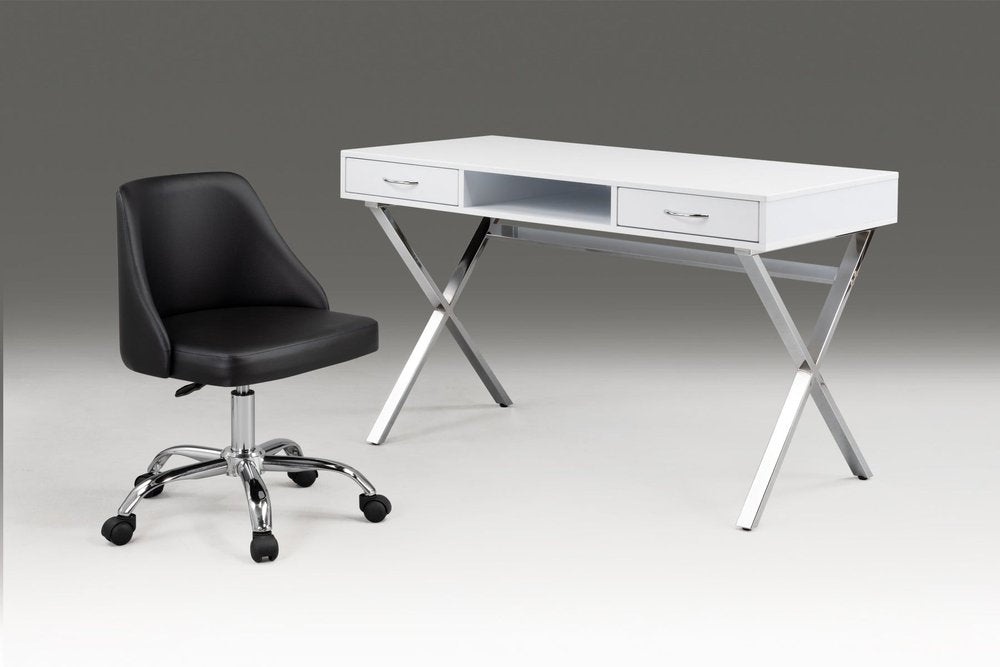 Upgrade your workspace with this black and silver adjustable height swivel rolling office chair. This chair features a steel frame to provide sturdiness when the chair is in use. Features a durable faux leather back for those who are looking for a softer, but still stylish and durable seating option. Cultivate a healthier posture this chair that lets you instantly fine-tune the height of your seat according to the height of your table, so you can minimize slouching and posture-related ailments such as neck/shoulder strains and backaches. Furnish your office or home office in comfort and style with this high-quality office chair. 29.3-inch h x 22-inch w x 22-inch d.