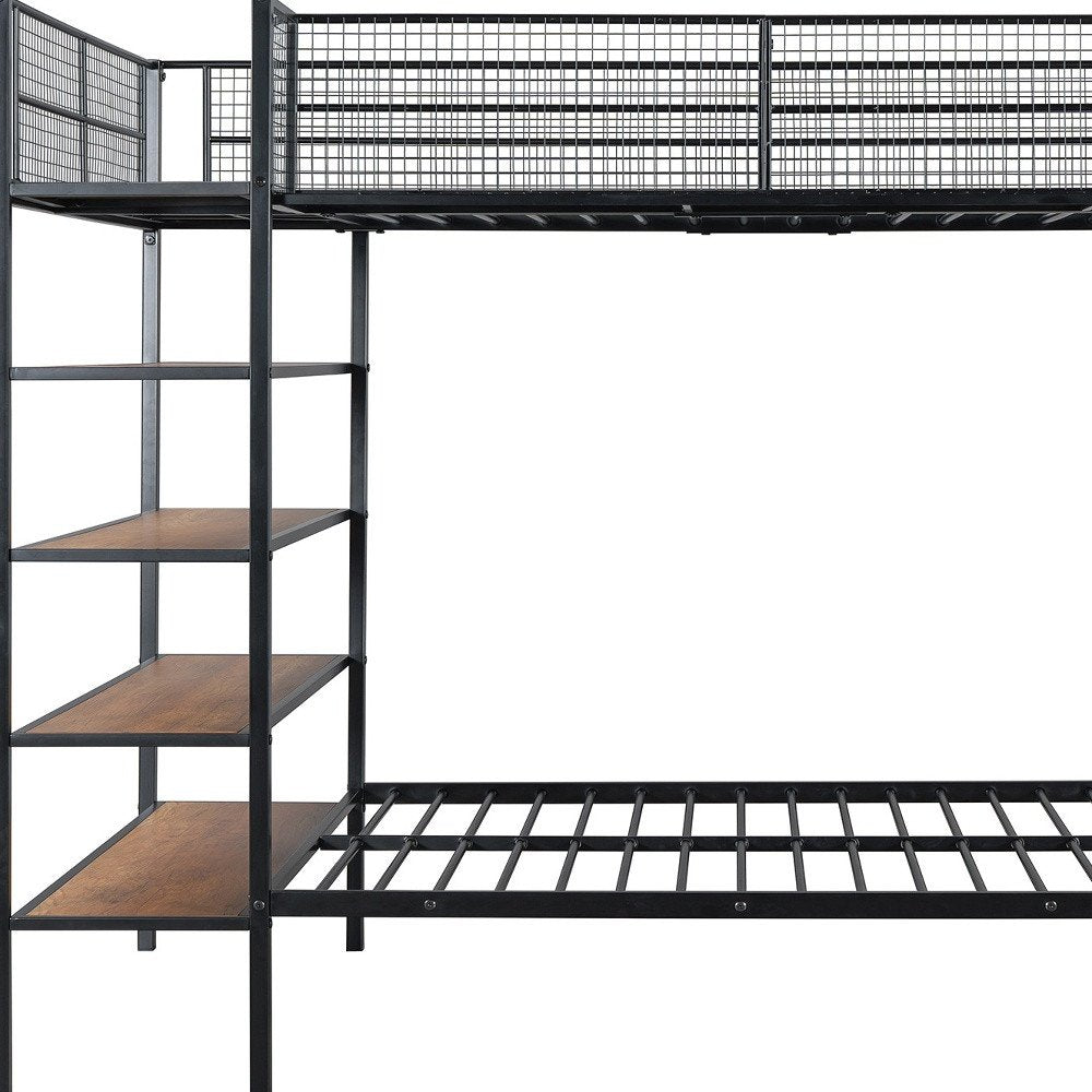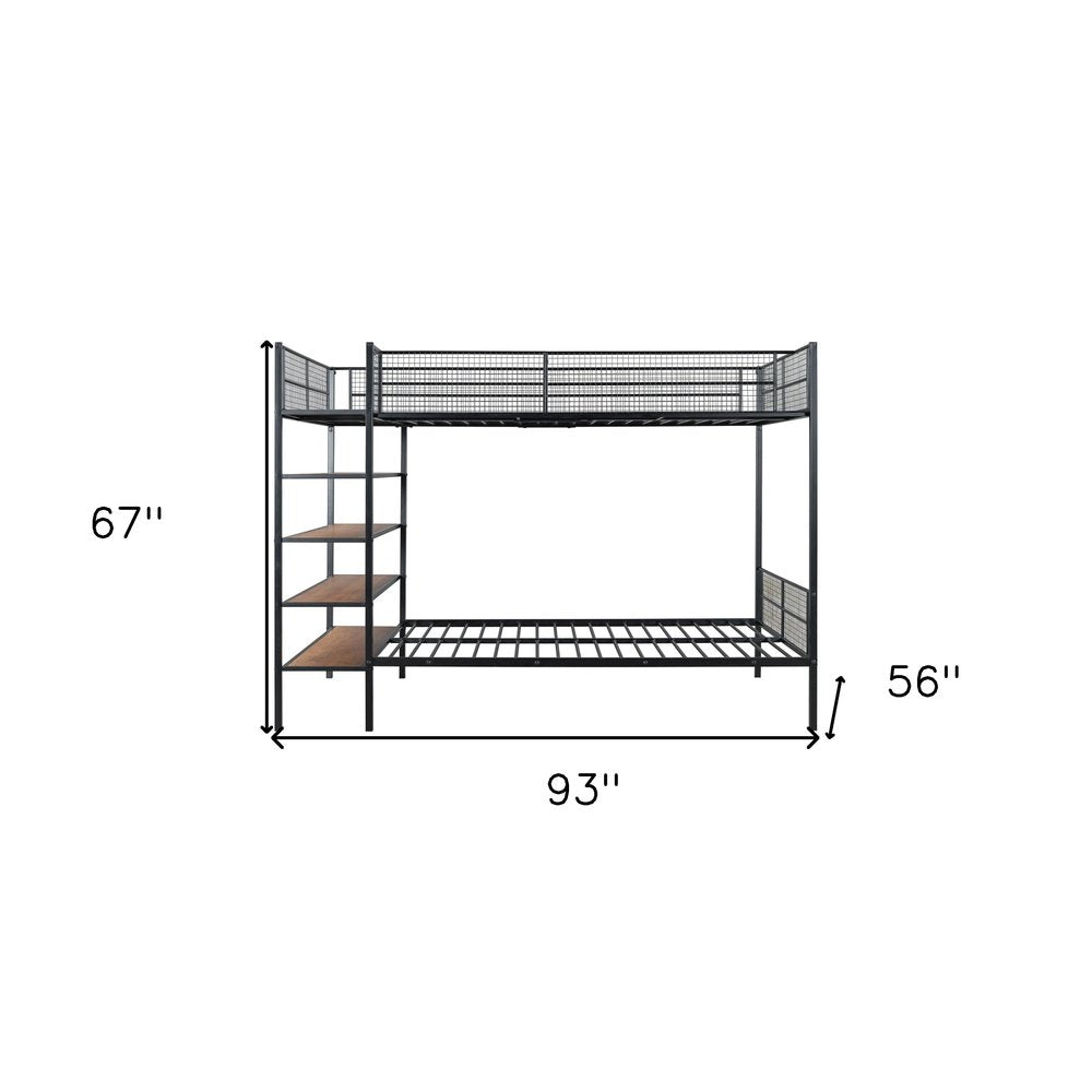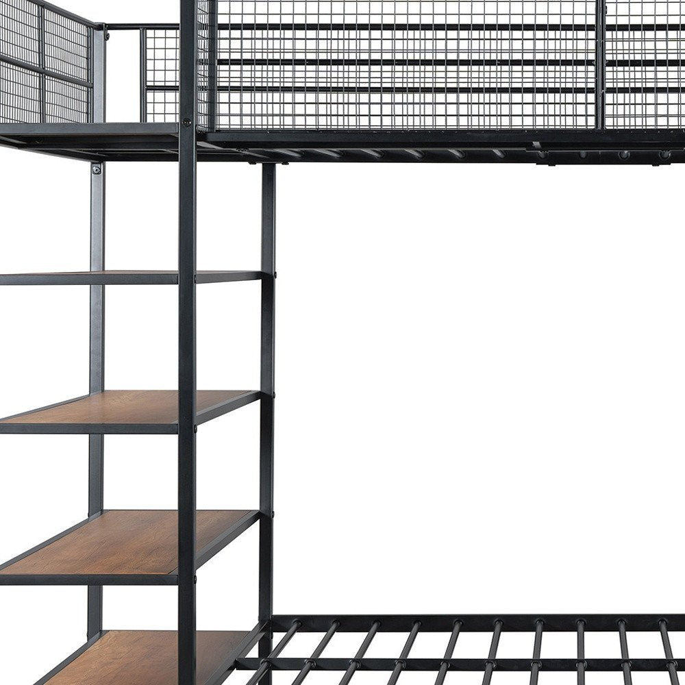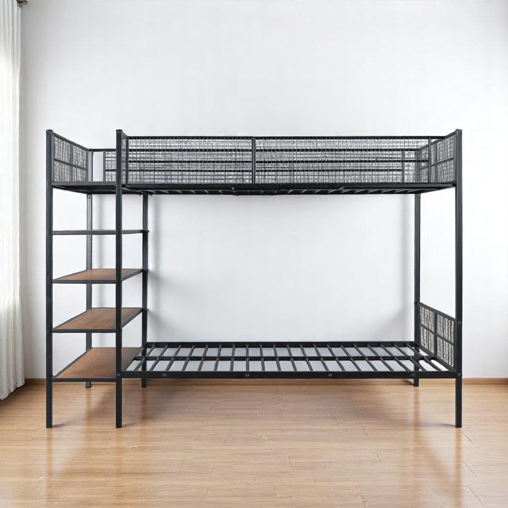 Con un diseño artístico y un encanto excepcional, la litera industrial de metal negra, de tamaño individual sobre matrimonial, con estantes, te garantiza un sueño reparador. Pintada en negro, le dará un toque atemporal a tu hogar. Esta exclusiva litera, de tamaño individual sobre matrimonial, brillará en cualquier habitación. La litera superior incluye una barandilla que protege a tus hijos de accidentes. Con un diseño eficiente, esta cama compacta pero espaciosa es súper práctica, cómoda y un verdadero deleite para la vista. Gracias a su elegante diseño de líneas limpias, ofrece comodidad y un toque de elegancia que realza la estética de cualquier dormitorio. 169 cm de alto x 235 cm de ancho x 142 cm de profundidad.