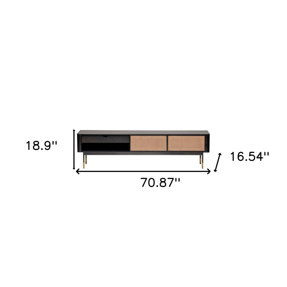 The perfect way to add a touch of natural contemporary design to your space, this Black Wood and Wicker Media Stand will elevate your living space instantly. The main body of this media stand is made from solid wood and colored to a matte black finish. Inside the main body there are two horizontal shelves, one hollow and one covered with a door. Next to this there are two compartments that have light brown wicker doors. The base of the stand has a simple four-legged design with each leg having gold accents on the bottom. This media stand will not only look great but also provides a lot of storage space. 18.9" H x 70.87" W x 16.54" D