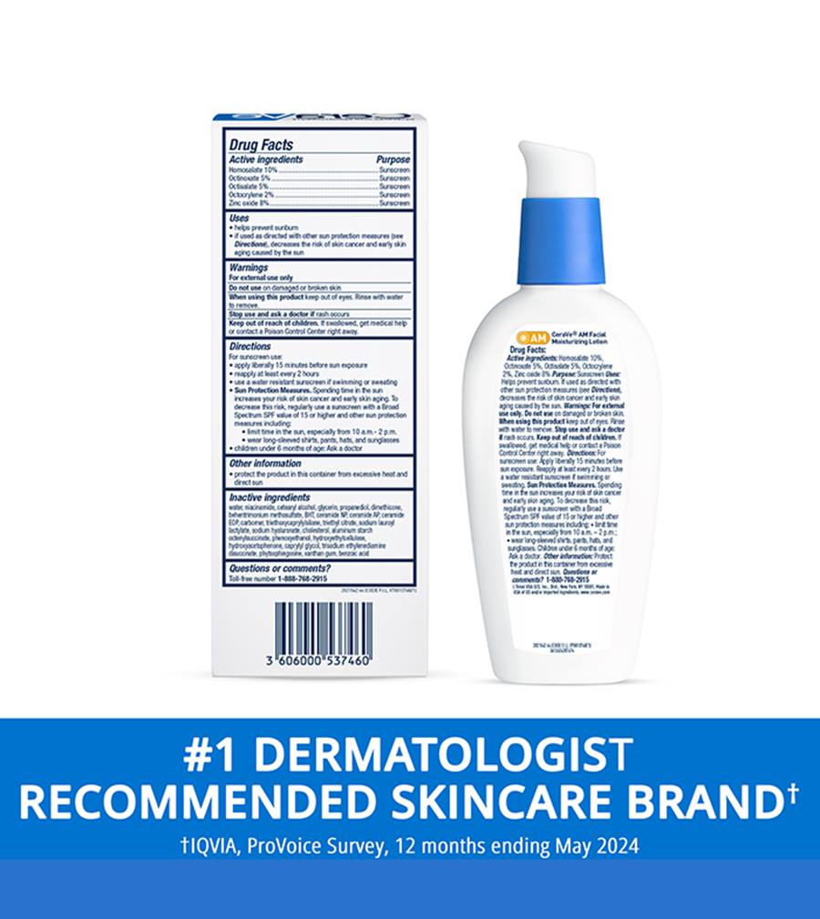 Desarrollada por dermatólogos, la Loción Hidratante Facial CeraVe AM con Protector Solar hidrata durante todo el día y ayuda a restaurar la barrera protectora de la piel. Esta loción con protector solar está formulada con FPS 30 de amplio espectro para una protección UV diaria, protegiendo la piel de los dañinos rayos UVA y UVB. Esta crema hidratante no comedogénica con FPS 30 se extiende fácilmente sin dejar residuos calcáreos.