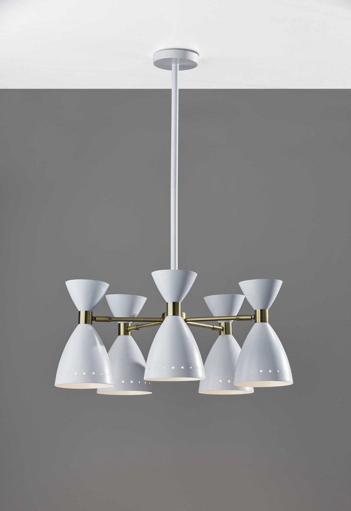 Añada un toque dramático y moderno a su entrada o sobre la mesa del comedor con esta lámpara colgante Cinco Diabolo. Con cinco pantallas ajustables de gran tamaño, esta lámpara proporciona una amplia iluminación superior a la vez que transforma el ambiente de la habitación. Los acabados en negro y latón antiguo se combinan para crear el estilo típico de mediados de siglo. Todos los productos de iluminación cuentan con certificación UL o ETL, lo que significa que han sido probados y aprobados para cumplir con las normas de seguridad gubernamentales de EE. UU.