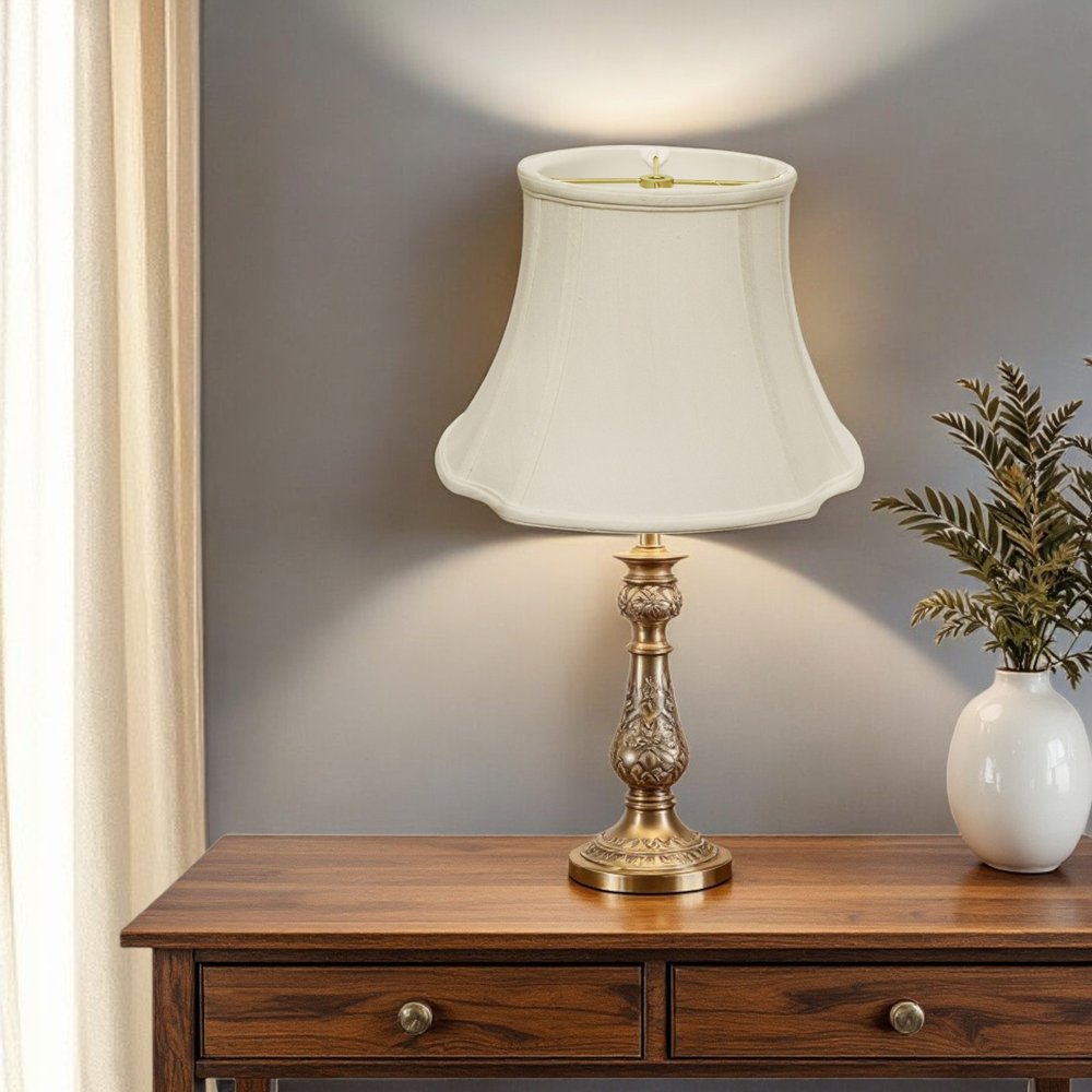 Realce su espacio con la sutil sofisticación de esta pantalla ovalada de 13 pulgadas en seda shantung Monay color crema. Elaborada con el lujoso material de seda shantung Monay, esta pantalla presenta una elegante forma ovalada con un ancho superior y una profundidad de 20 cm. Su altura inclinada de 23 cm añade un toque de encanto rústico a la vez que proporciona un cálido color crema que complementa a la perfección cualquier decoración. Su fijación tipo araña garantiza una fácil instalación, convirtiéndola en un complemento versátil y elegante para la iluminación de su hogar. Ilumine su habitación con esta exquisita pantalla que irradia gracia atemporal y refinada elegancia. 23 cm de alto x 33 cm de ancho x 33 cm de profundidad.
