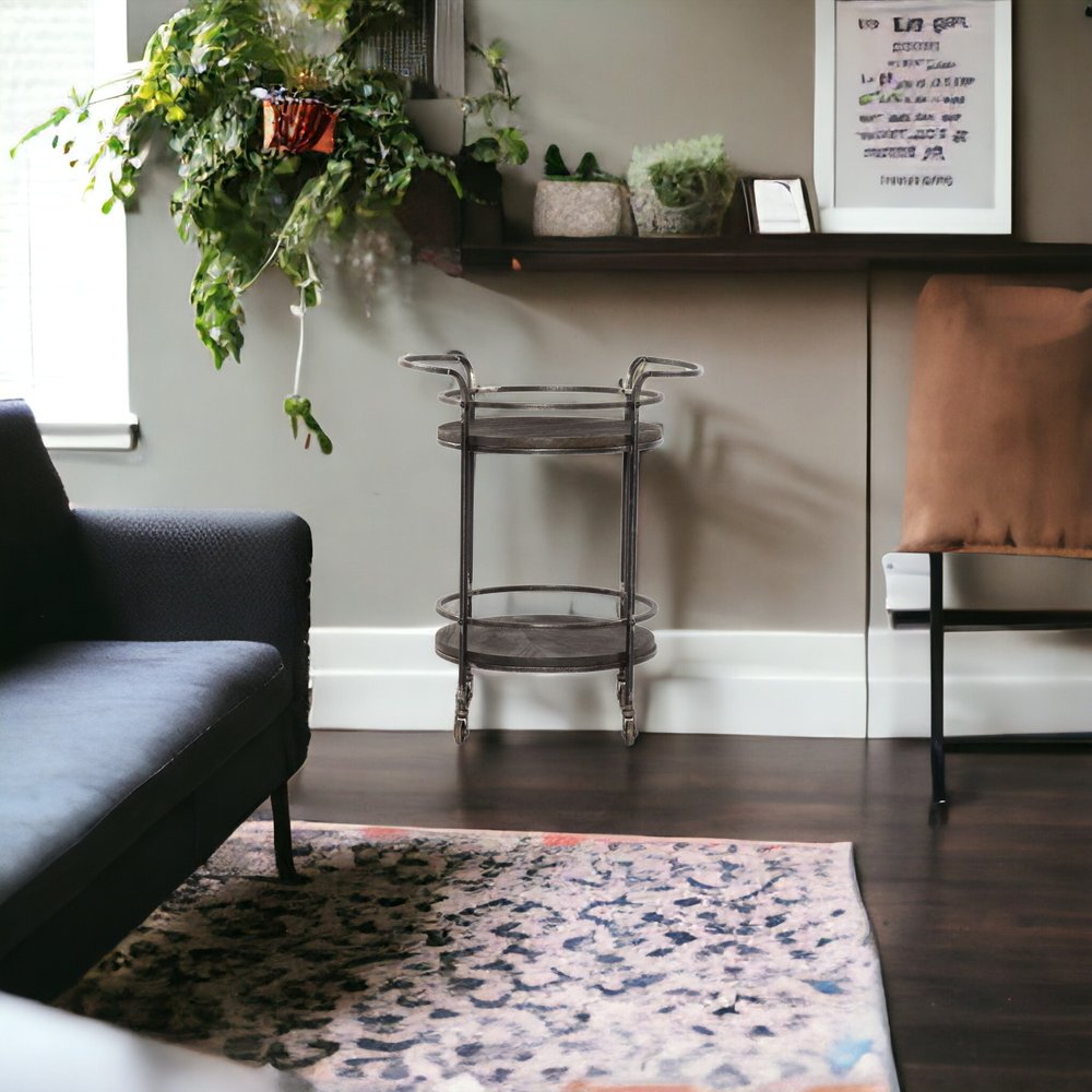 Add a touch of modern rustic and functionality to your home with this dark gray iron and solid wood round rolling bar cart. The bar cart frame is made from durable iron, ensuring stability and longevity. The solid wood top adds a natural and elegant touch to the overall design. With its round shape, this bar cart stands out as a stylish centerpiece. A versatile piece for any space. The rustic dark gray color adds a subtle and modern touch to your home. Enhance your entertaining experience and bring convenience to your home with this charming bar cart. 29-inch H x 22-inch W x 17-inch D