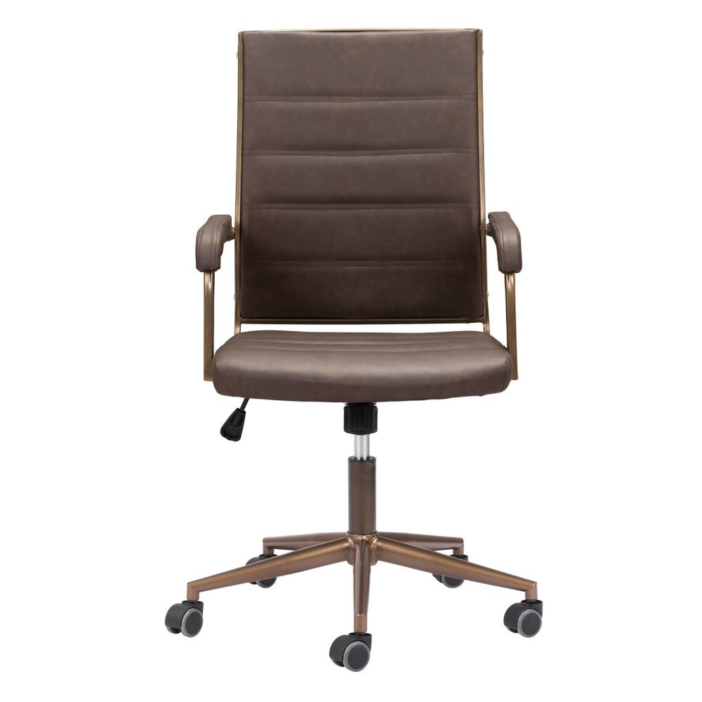Más allá de ser un simple punto de apoyo para estudiar o trabajar, esta elegante silla de oficina giratoria con ruedas y altura ajustable en color espresso y bronce aporta estilo y funcionalidad a su espacio de trabajo. Su estructura de acero le proporciona robustez durante su uso. Cómoda y elegante, su resistente respaldo de piel sintética y su estética general mejoran la dinámica de la habitación. Su diseño es ajustable en altura para personalizar su espacio. Amueble su oficina o despacho en casa con comodidad y estilo con esta silla de oficina de alta calidad. 105 cm de alto x 63 cm de ancho x 68 cm de profundidad.