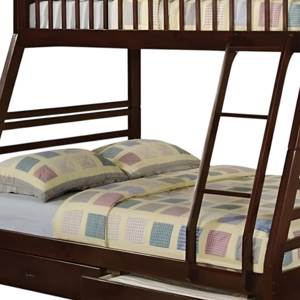 Litera Espresso de madera maciza con espacio de almacenamiento, dos camas individuales sobre una cama matrimonial