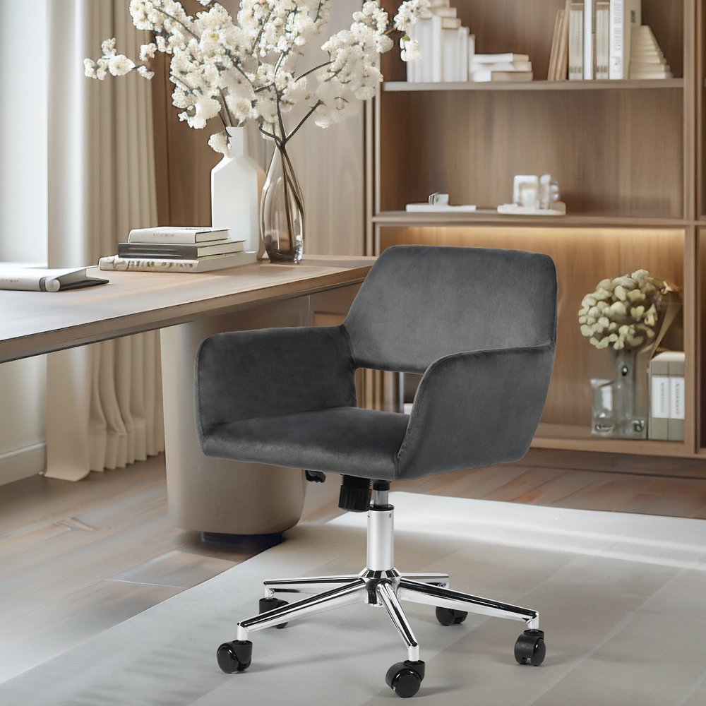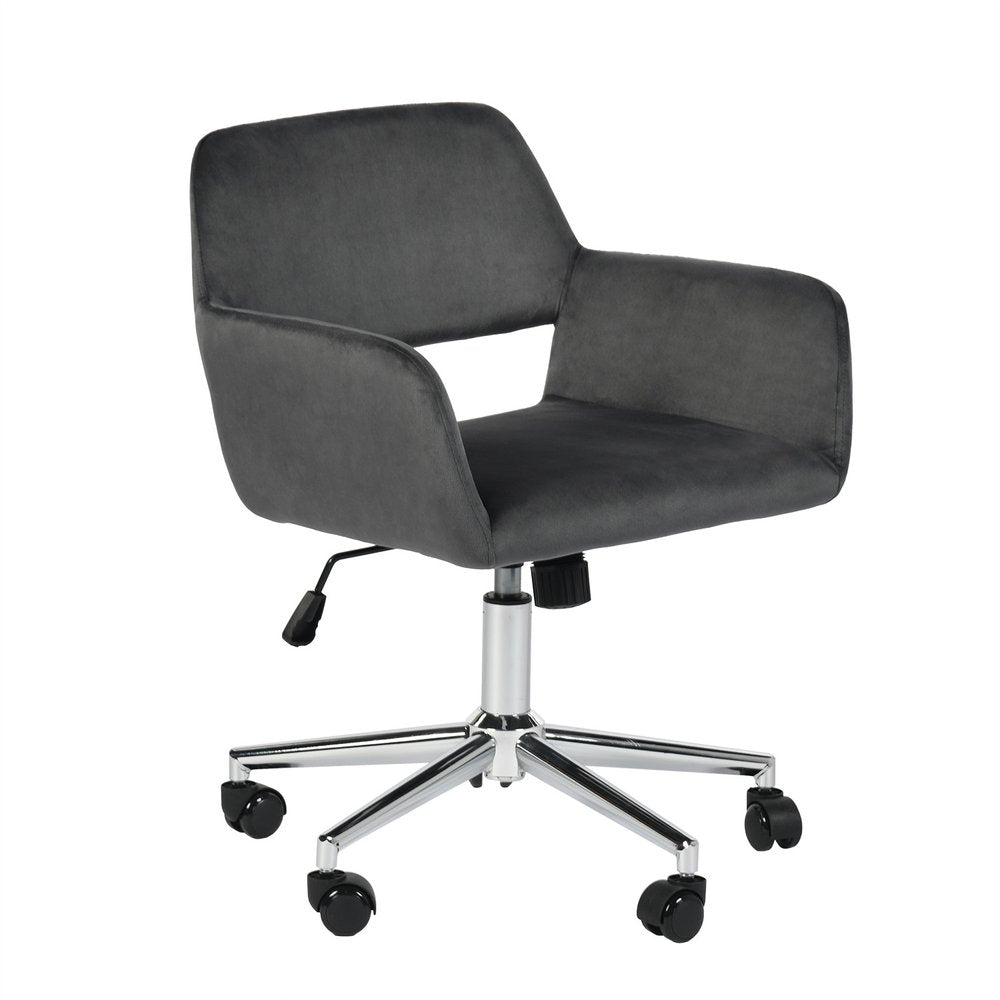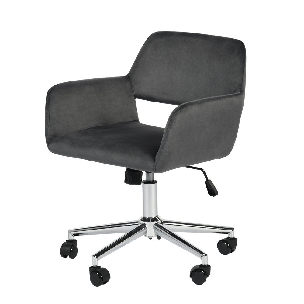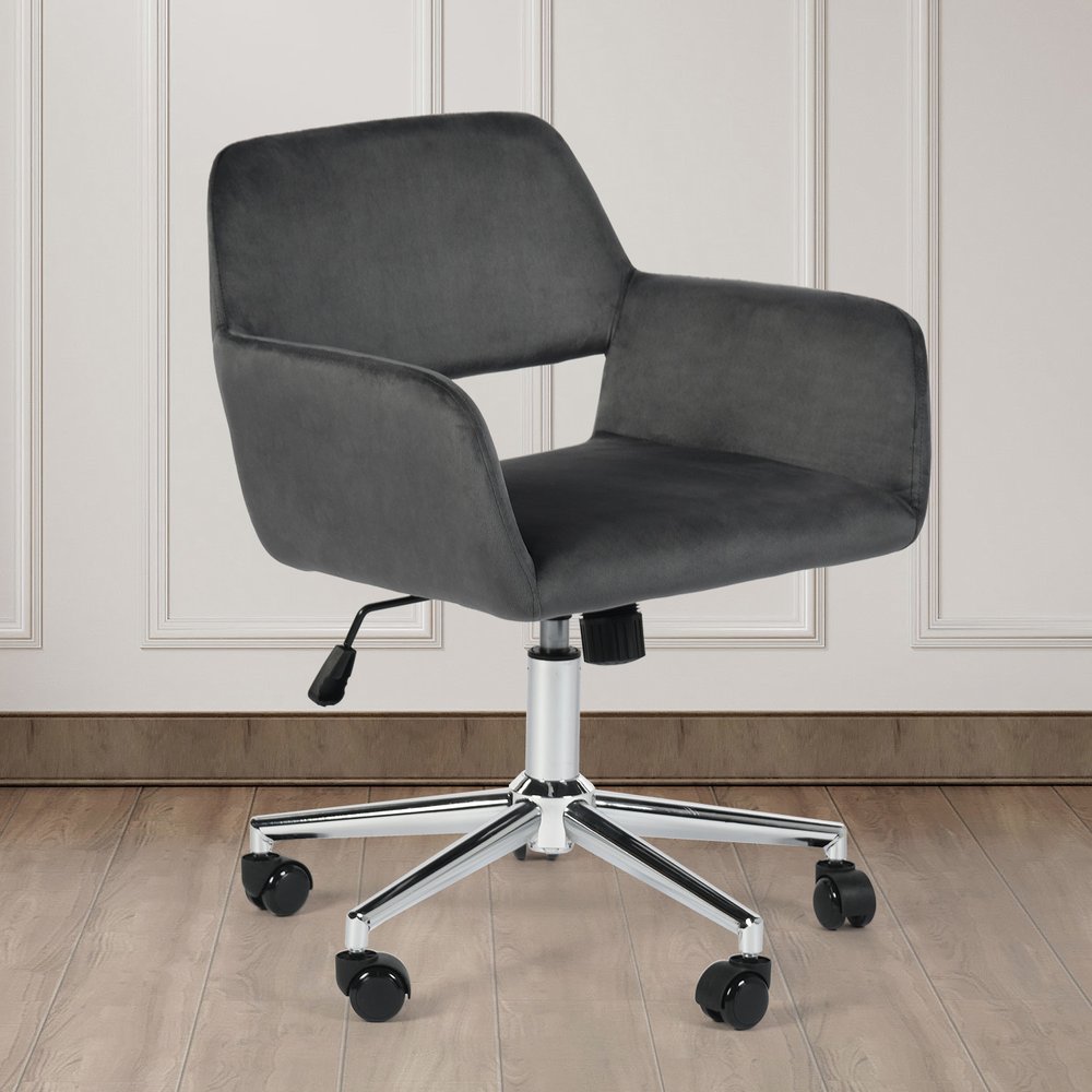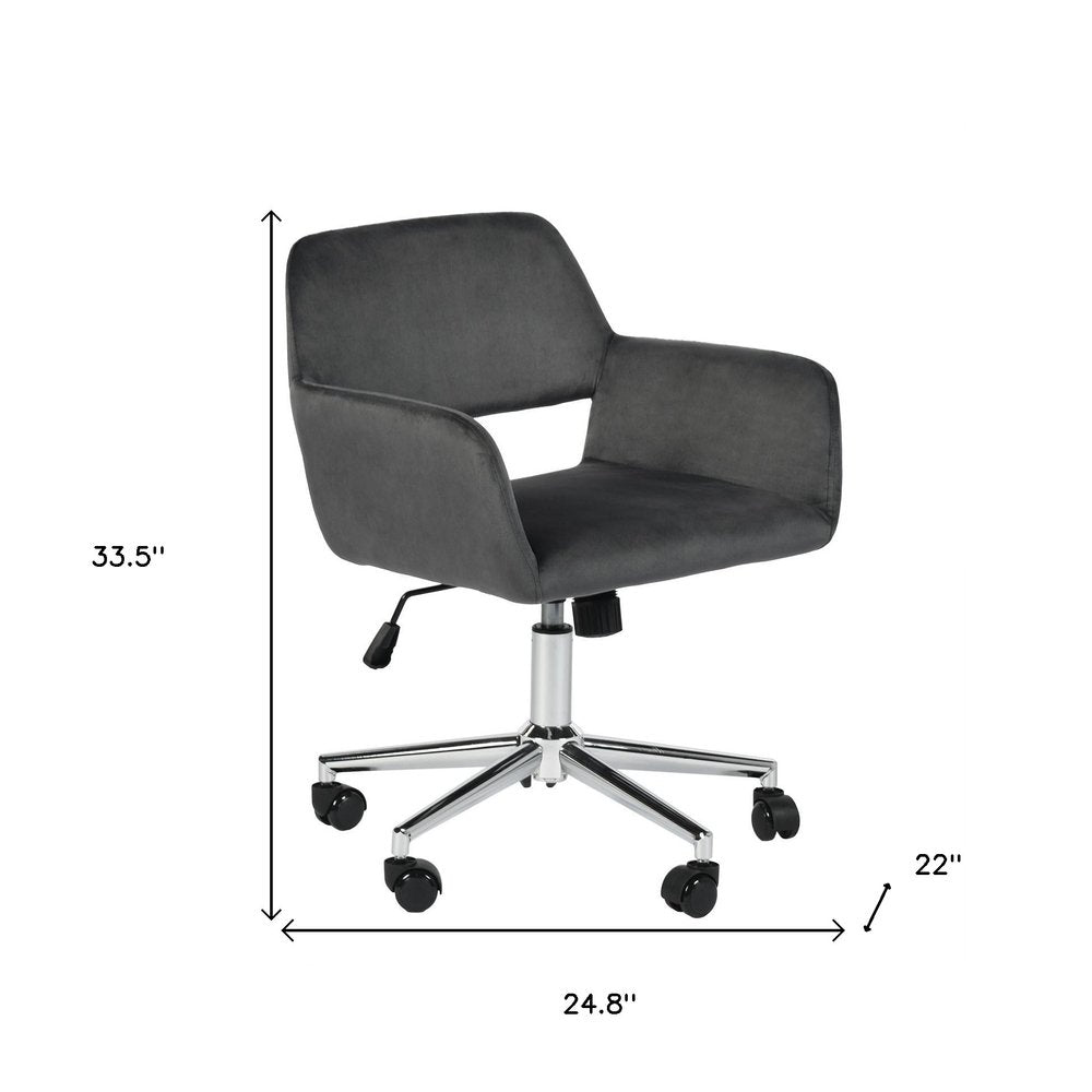 Upgrade your workspace with this gray and silver upholstered and steel adjustable swivel rolling office chair. This chair features a steel frame to provide sturdiness when the chair is in use. Cultivate a healthier posture this chair that lets you instantly fine-tune the height of your seat according to the height of your table, so you can minimize slouching and posture-related ailments such as neck/shoulder strains and backaches. Furnish your office or home office in comfort and style with this high-quality office chair. 33.5-inch h x 24.8-inch w x 22-inch d.