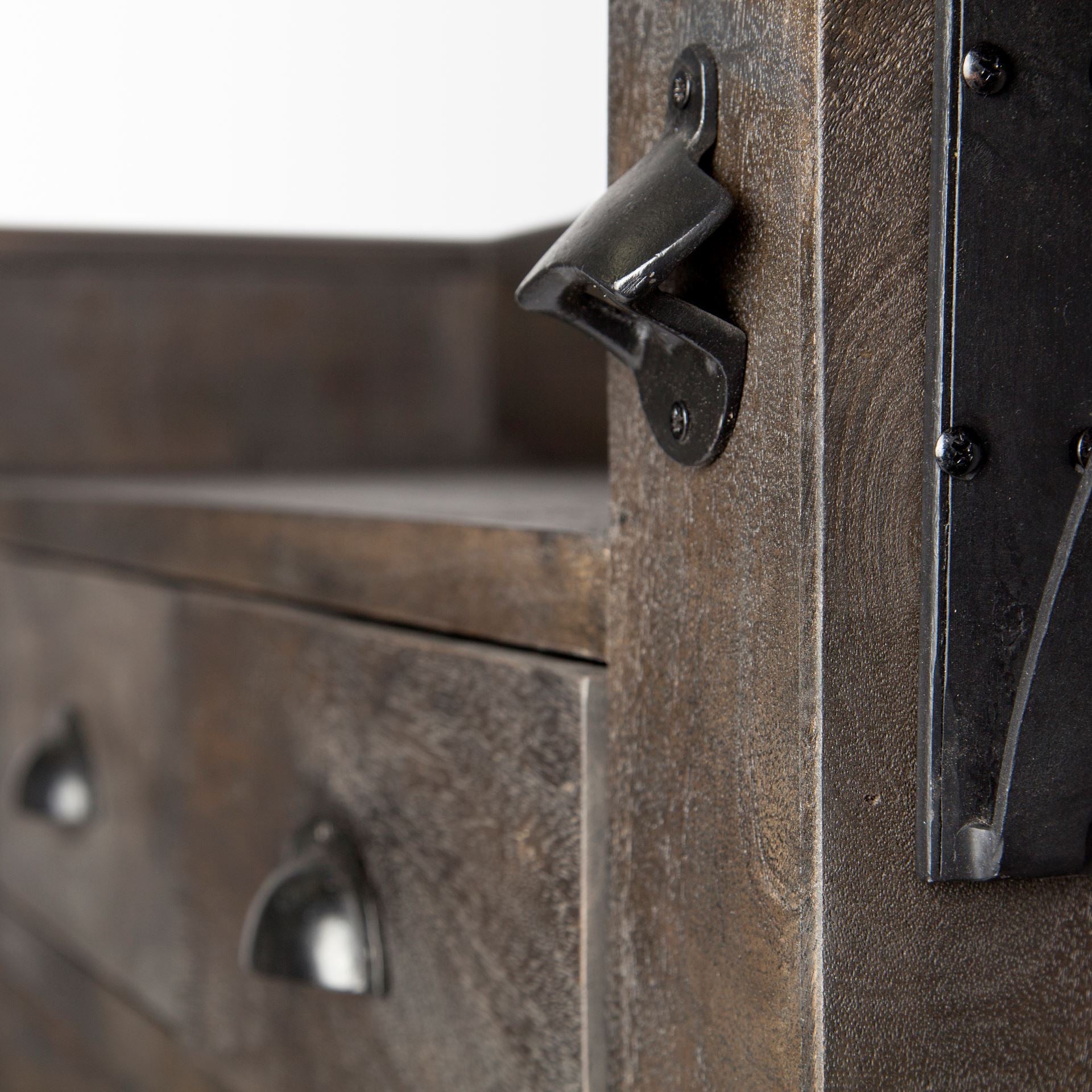 Isla de cocina de madera maciza gris con almacenamiento para botellas de vino | Una elegante barra de madera con almacenamiento para botellas de vino y accesorios de bar.