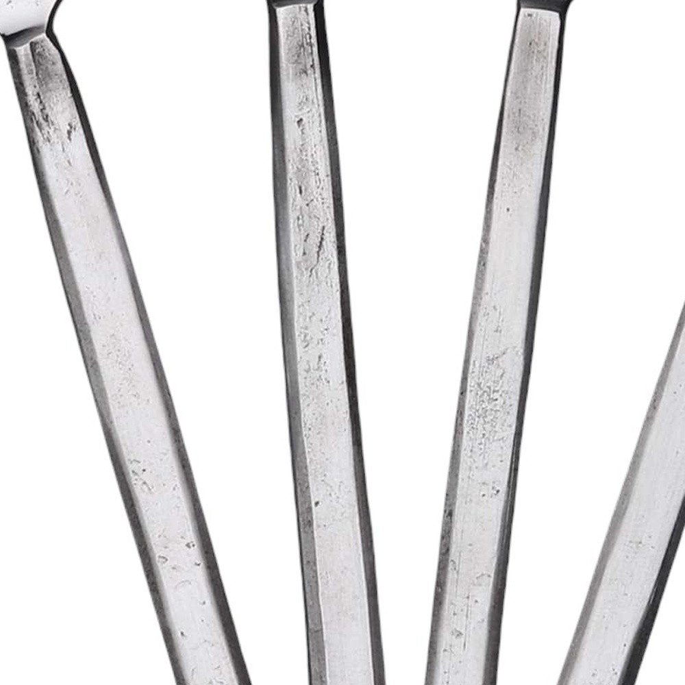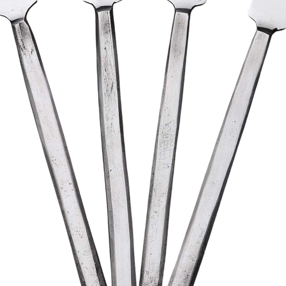 The hammered silver stainless steel four piece hand forged butter knife brings an elegant touch to your dining experience. This beautifully crafted butter knife set includes four pieces, perfect for serving your favorite cheeses. Each knife features a solid handle, providing both durability and style. Crafted with a hand-forged construction method, this flatware reflects a rustic charm that enhances any table setting. The stunning silver color of the stainless steel adds sophistication and shine to your dining decor. Ideal for gatherings and special occasions, this cheese serving set is designed to serve four, making it an essential addition to your kitchen collection. Enjoy the blend of functionality and aesthetic appeal with this exquisite butter knife set. 6-inch h x 0.5-inch w x 0.2-inch d.