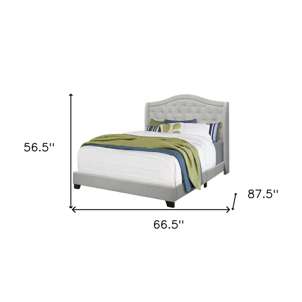 Marco de cama tamaño queen tapizado con mechones de madera gris claro y gris con ribete de tachuelas