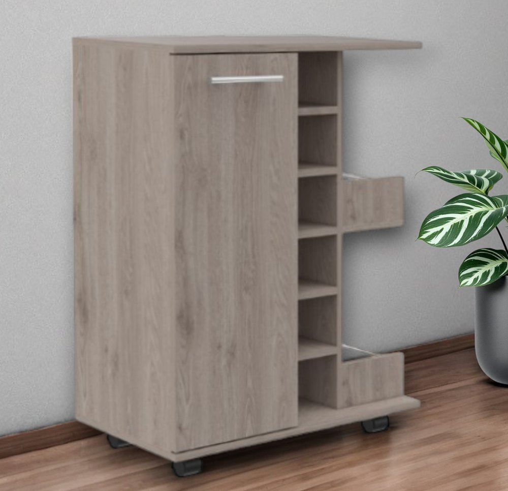 This light gray rolling bar cart is the perfect addition to any home. With its sleek and contemporary style, it will seamlessly blend into any decor. Made from durable particle board, this bar cart is built to last. It features a spacious display stand cabinet with shelves for all your bar essentials. The rectangular shape and freestanding design make it easy to move around your space. The bar cart also includes wheels for added convenience. Not only does it provide ample storage for your favorite wines, but it can also hold up to 6 wine bottles. With its light gray color and laminate top, this bar cart is both stylish and functional. Get ready to entertain in style with this stunning rolling bar cart. 32.4-inch H x 23.7-inch W x 14.8-inch D