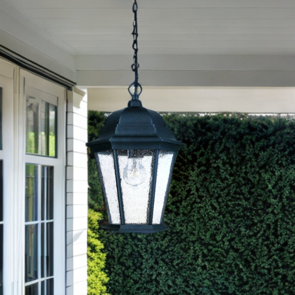 Realce la apariencia de su espacio exterior con esta lámpara colgante tipo farol con cúpula en negro mate. La cadena colgante tiene un acabado en negro mate y se fija a la lámpara mediante un gancho circular. La parte superior de la lámpara tiene un diseño de cúpula de dos niveles con ligeros detalles en los bordes. La parte central presenta un diseño de varilla fina con un patrón cónico que termina en una base plana. El color negro mate del marco resalta gracias a los paneles de vidrio texturizado del interior. Úselo solo o en pares alrededor de su puerta principal o paredes exteriores. 35,5 cm de alto x 24,1 cm de ancho x 24,1 cm de profundidad.