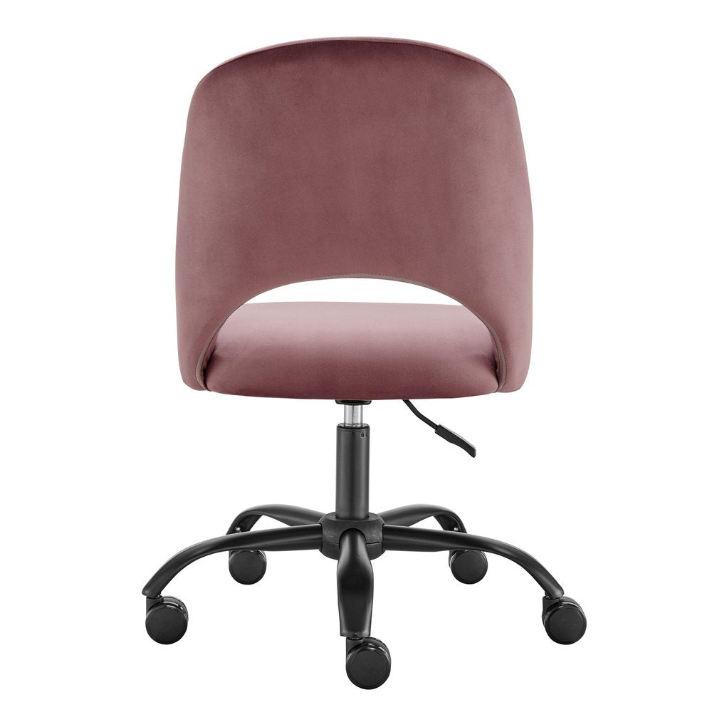 This chair features a steel frame to provide sturdiness when the chair is in use. This design is height-adjustable to personally tailor your space. Furnish your office or home office in comfort and style with this high-quality office chair. The sleek black frame complements the sumptuous rose upholstery, creating a contemporary look. With a swivel feature for easy movement, it caters to various flooring types, enhancing versatility in any workspace. Enjoy the plush comfort of its upholstered seat and back, designed for prolonged use. 37.6-inch h x 20.08-inch w x 23.82-inch d.