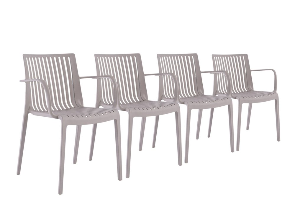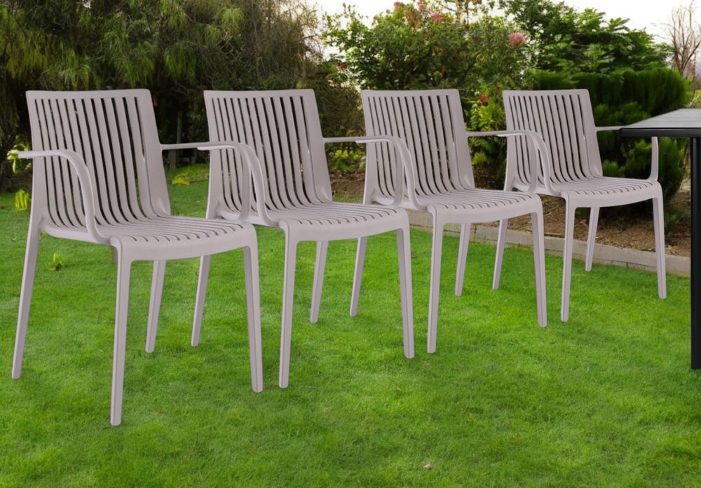 Experimente la combinación perfecta de comodidad y sofisticación con el juego de cuatro sillones apilables para exteriores de plástico resistente color topo de 56 cm, diseñados para mejorar su experiencia al aire libre. Seguros para usar tanto en interiores como en exteriores, estos sillones están diseñados para ser duraderos y cómodos. Su respaldo de listones les da un estilo fresco y moderno. Disfrute de la buena vida a diario con esta moderna opción de asiento para exteriores. 82 cm de alto x 57 cm de ancho x 57 cm de profundidad.