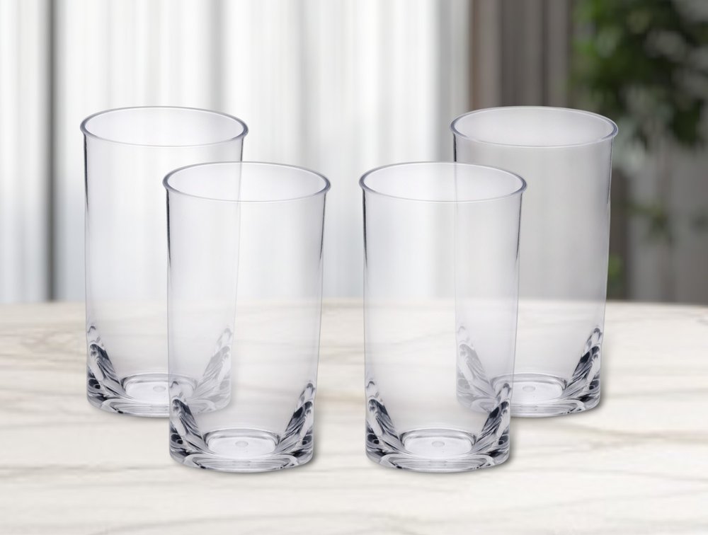 Juego de cuatro vasos altos de plástico Tritan transparente
