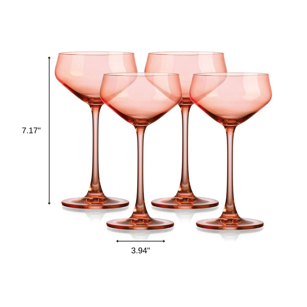 Savor the taste of your favorite cocktail in chic style with this set of four coral crystal shallow bowl stemmed coupe. This glassware set is a perfect addition to any bar or drinkware collection. The graceful stem adds an air of sophistication to your favorite beverage. Includes a decorative clear rim to enhance the look and elegance of the glass. Add iconic style to your setting with this good looking solid color pattern. The smooth non-texture of this surface will feel elegant and sleek in your hand. Sipping from the right glass can make the difference between a drink and an amazing experience. 7.17-inch H x 3.94-inch W x 3.94-inch D