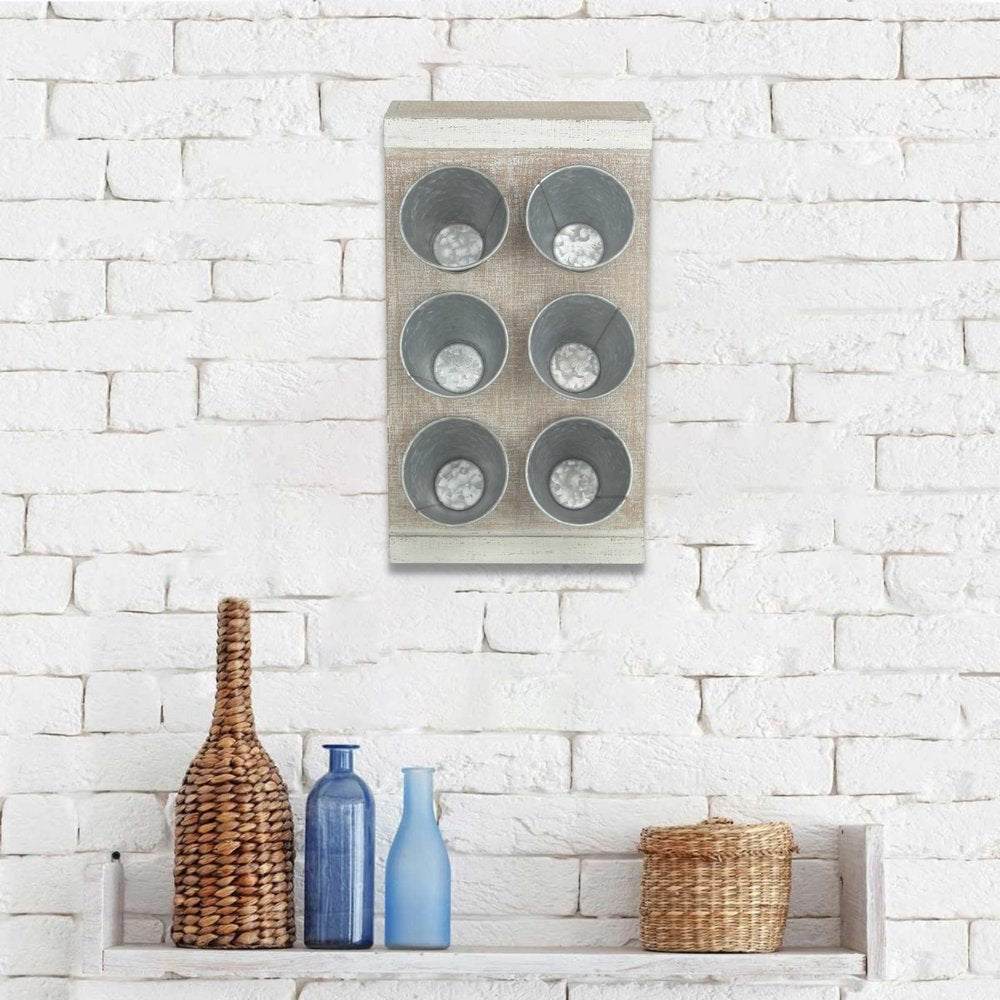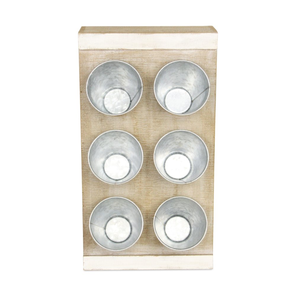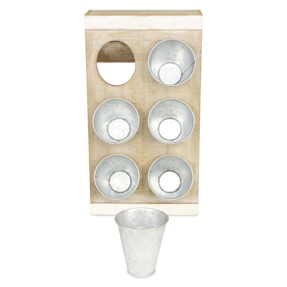 Set of six natural and silver metal and wood 10 ounce wall planters with stand offers a stylish way to elevate your indoor greenery. Crafted from a combination of metal and wood, this planter set features a rustic look and purposeful distressing to add a touch of vintage charm. Included in this set is a sturdy wood stand that hangs on the wall to showcase the six galvanized metal planters elegantly on your wall. Perfect for showcasing small plants or herbs, these planters are ideal for adding a refreshing touch to your living space while maximizing vertical storage. Embrace the beauty of nature indoors with this versatile planter set. 18.25-inch h x 10.00-inch w x 4.25-inch d.