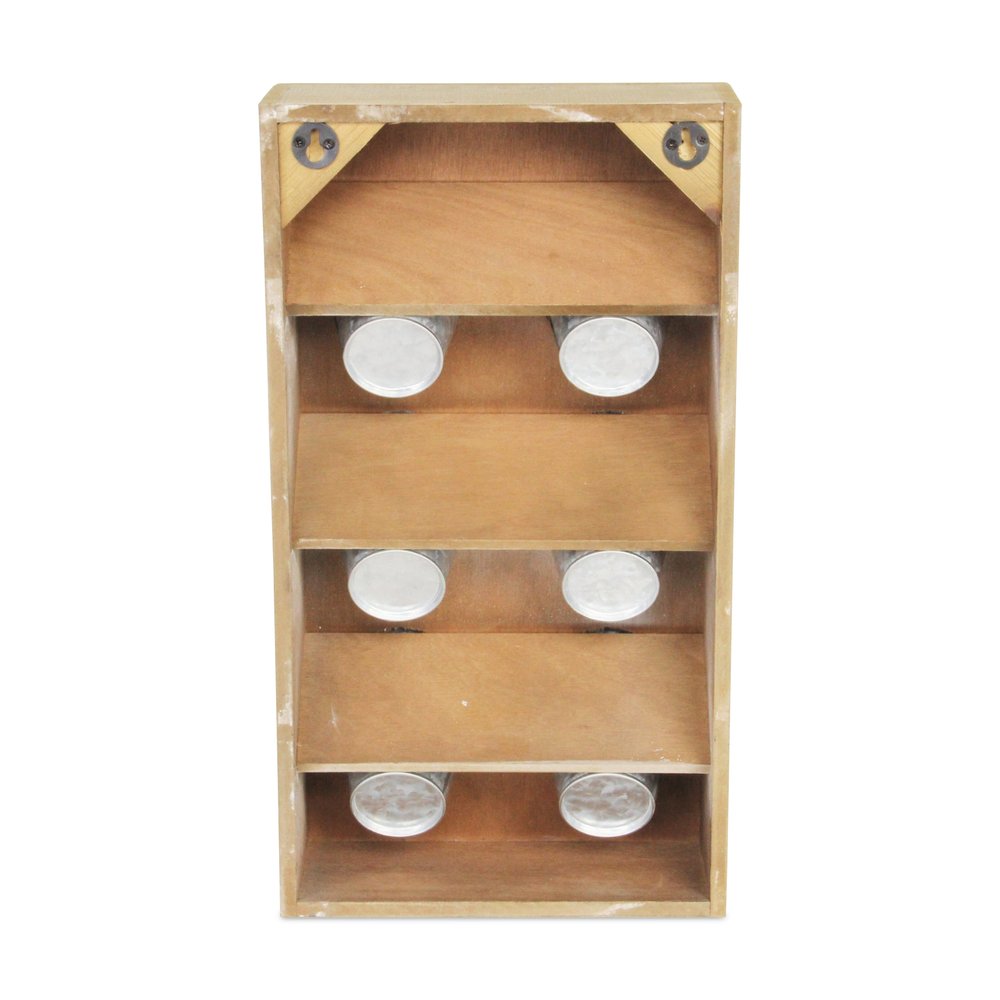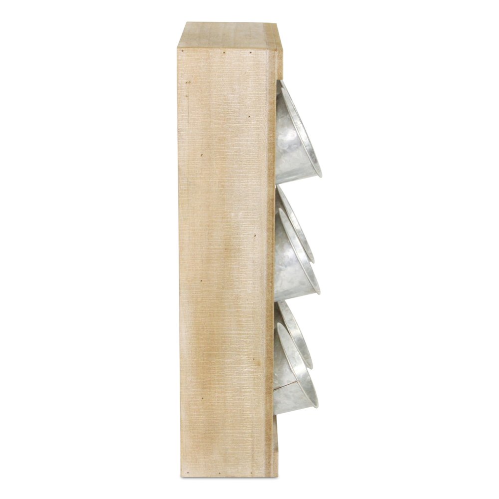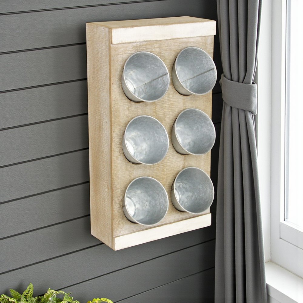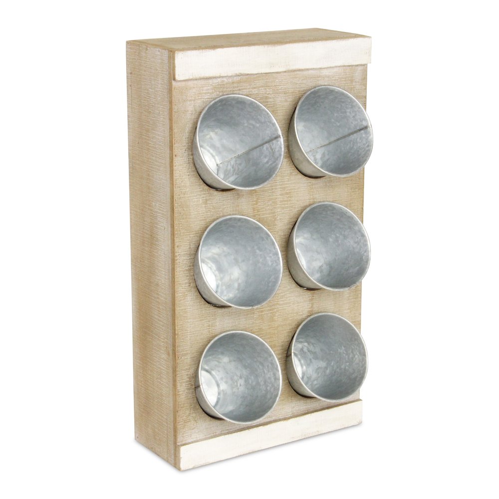 Set of six natural and silver metal and wood 10 ounce wall planters with stand offers a stylish way to elevate your indoor greenery. Crafted from a combination of metal and wood, this planter set features a rustic look and purposeful distressing to add a touch of vintage charm. Included in this set is a sturdy wood stand that hangs on the wall to showcase the six galvanized metal planters elegantly on your wall. Perfect for showcasing small plants or herbs, these planters are ideal for adding a refreshing touch to your living space while maximizing vertical storage. Embrace the beauty of nature indoors with this versatile planter set. 18.25-inch h x 10.00-inch w x 4.25-inch d.