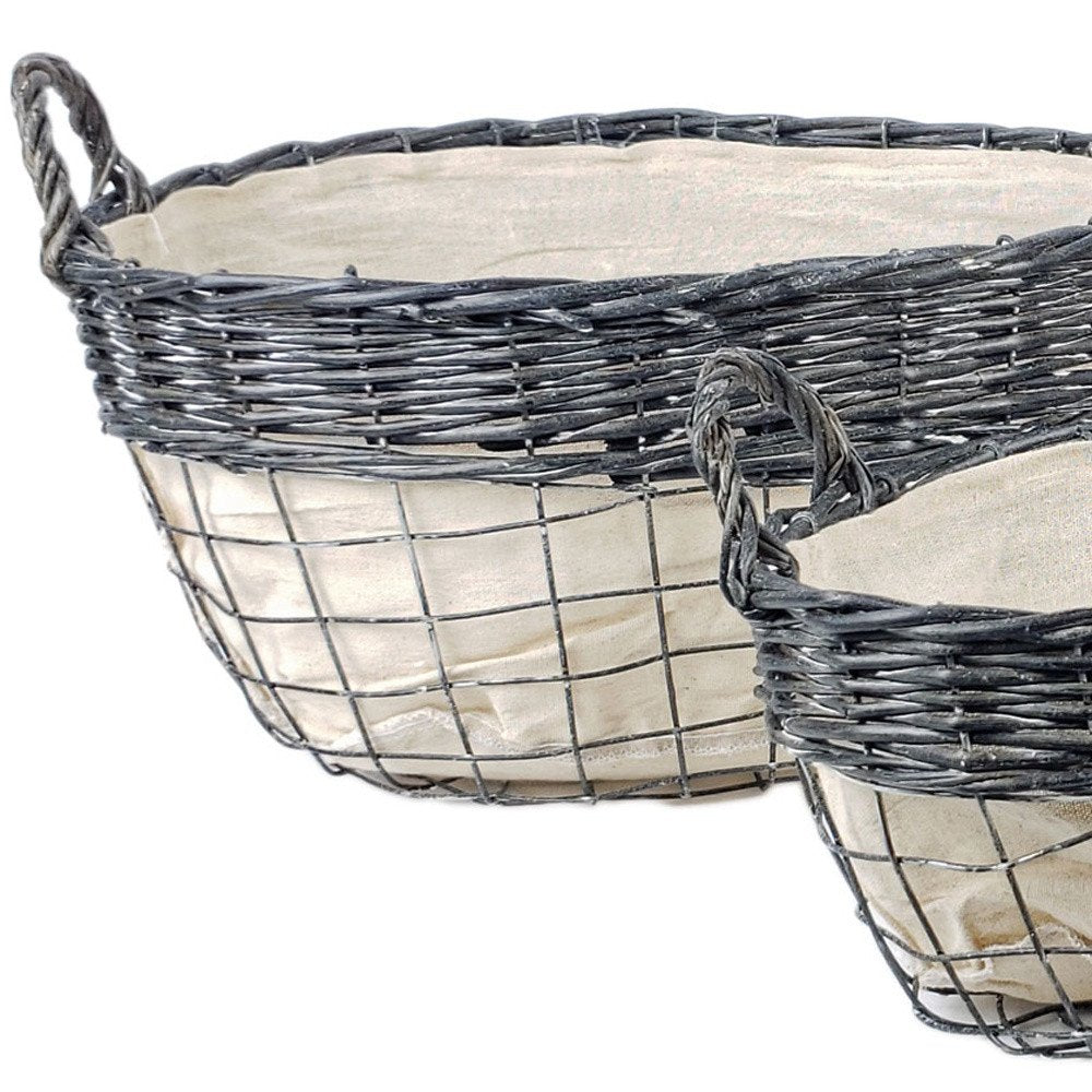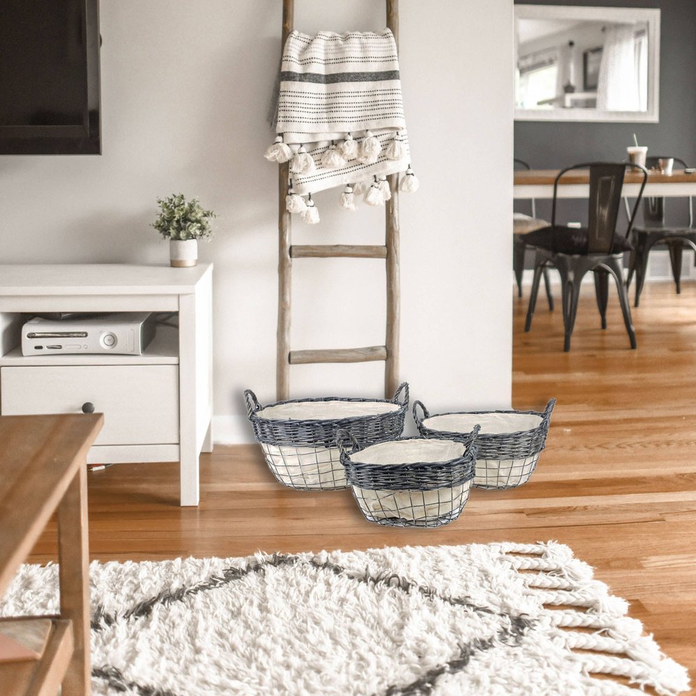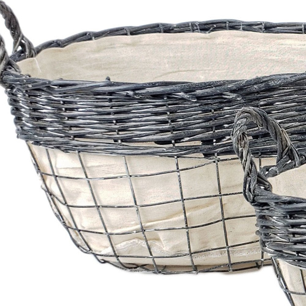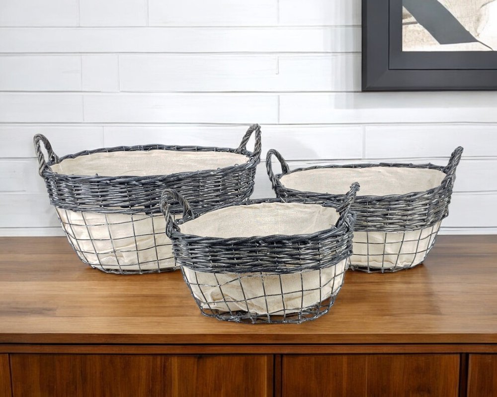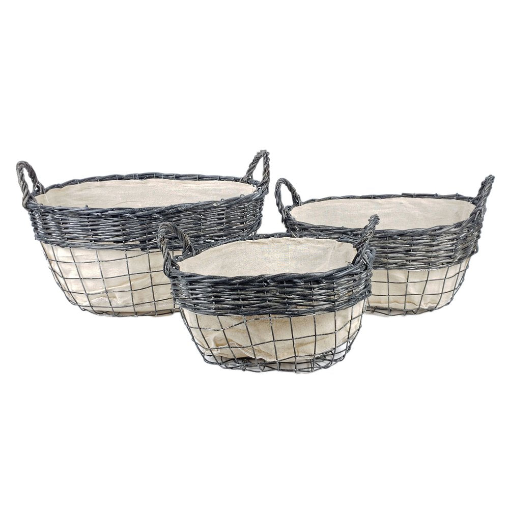 Juego de tres cestas de hierro y mimbre en gris y beige