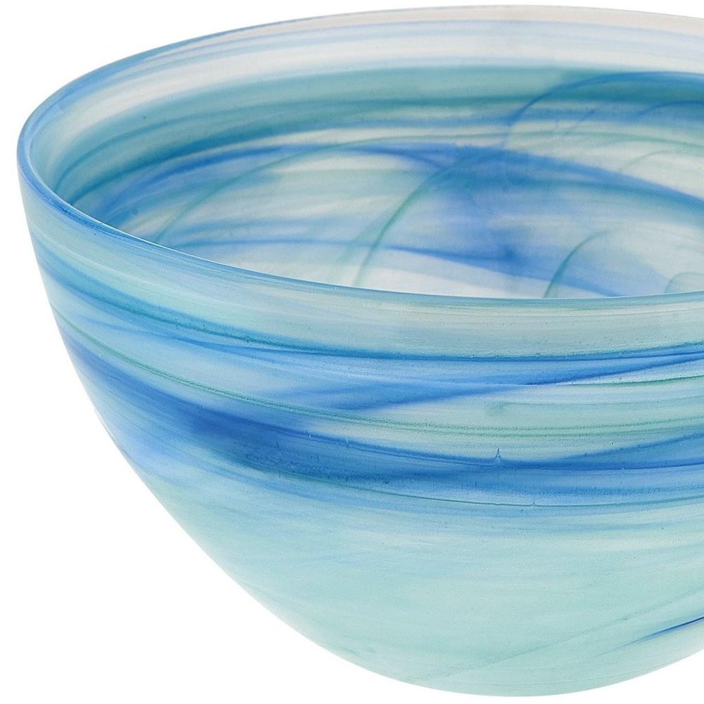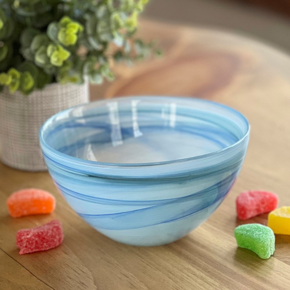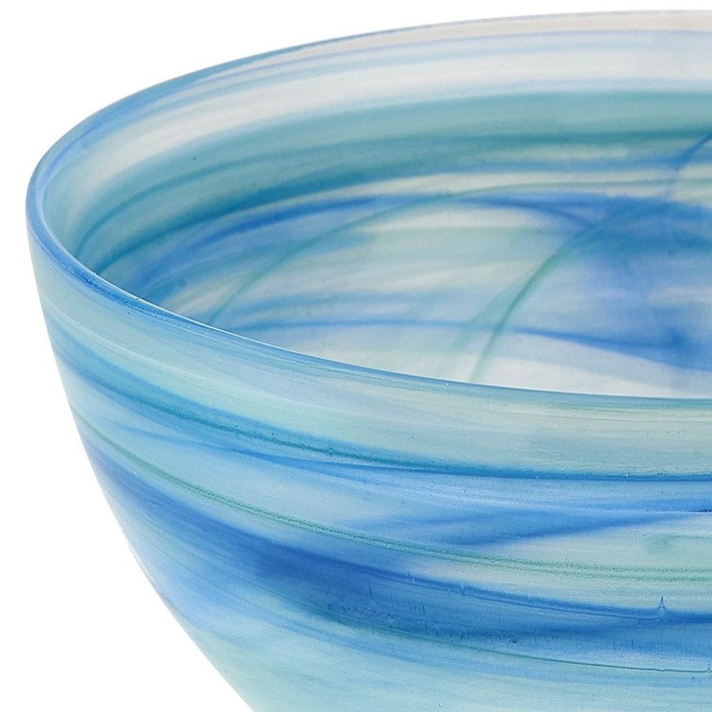 El juego de dos cuencos redondos de 15 cm de vidrio de alabastro azul agua y blanco para dulces o frutos secos es el complemento perfecto para tu hogar. Hechos a mano en Europa con vidrio de alabastro de alta calidad, este juego de cuencos presenta una atractiva combinación de relajantes tonos costeros. Su moderna y suave forma cuadrada complementa a la perfección los estilos de decoración contemporáneos, haciéndolos ideales tanto para el día a día como para ocasiones especiales. Realza tu espacio con estos cuencos únicos y elegantes que combinan estética y practicidad. 6,35 cm de alto x 15 cm de ancho x 15 cm de profundidad.