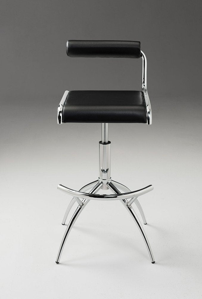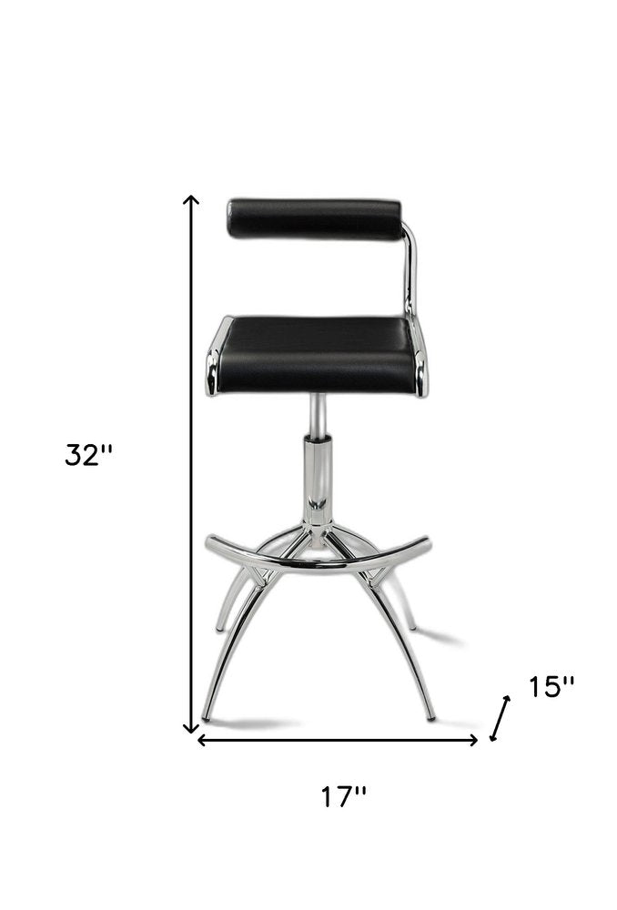 Bring a trendy bar vibe to your space, with this set of two black and silver faux leather and metal low back adjustable height bar chairs. Quality construction from silver metal combines with black faux leather to give this stool a fresh and updated look. Not only good looking and stylish, but this chair also features a rectangle shaped seat and a low back for the ultimate in comfort and enjoyment. Designed with a footrest for comfort and convenience. 32-inch h x 17-inch w x 15-inch d.