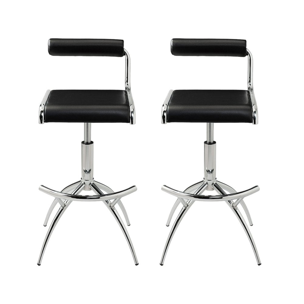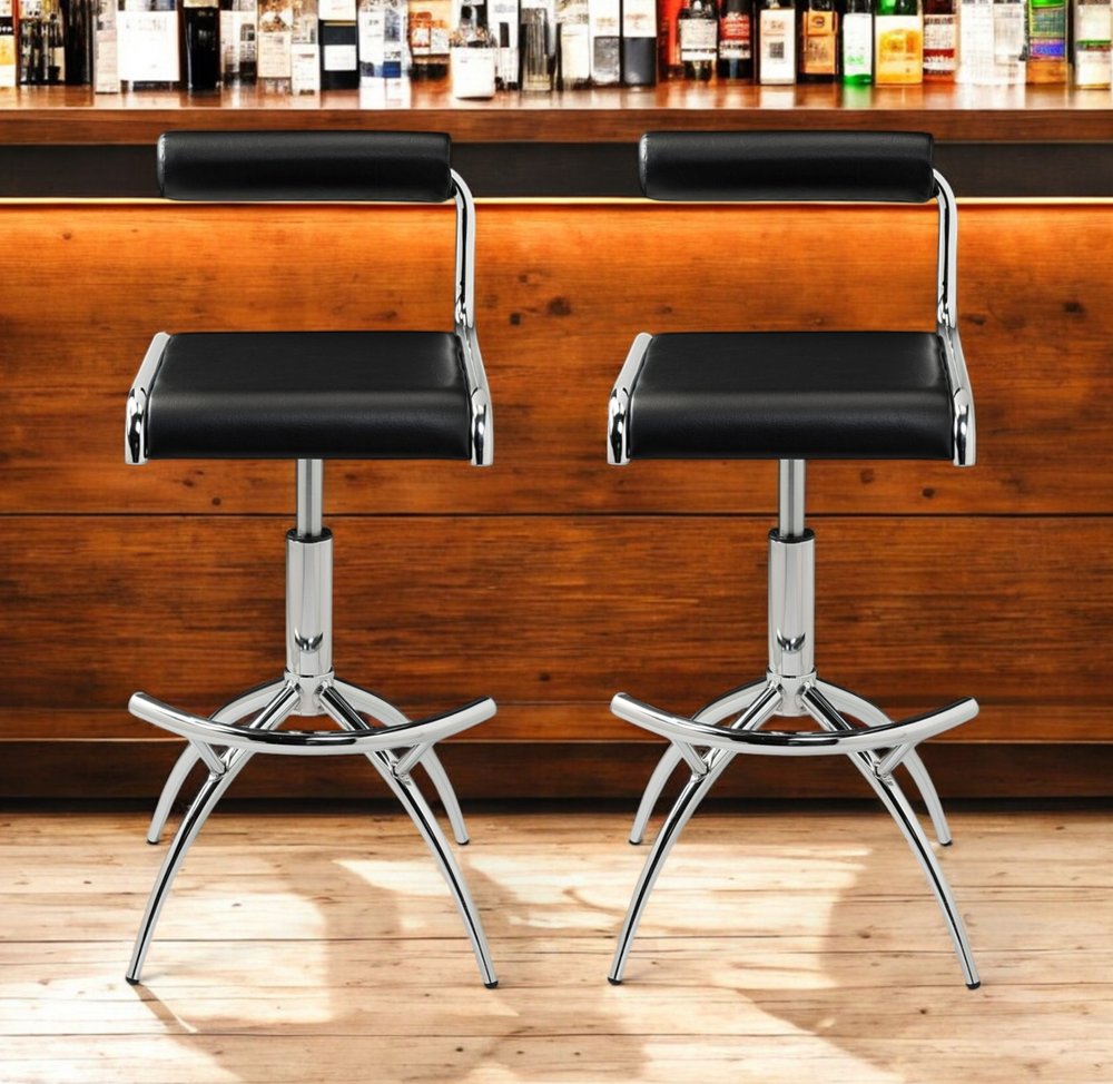 Set of Two Black and Silver Faux Leather and Metal Low Back Adjustable Height Bar Chairs