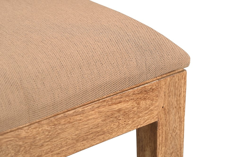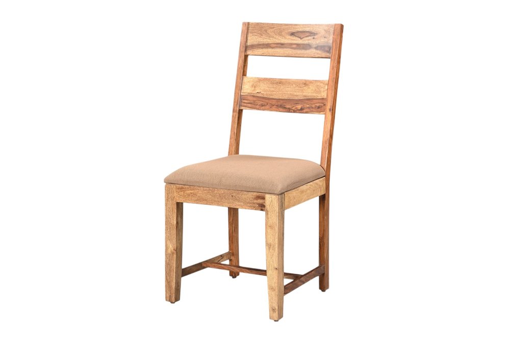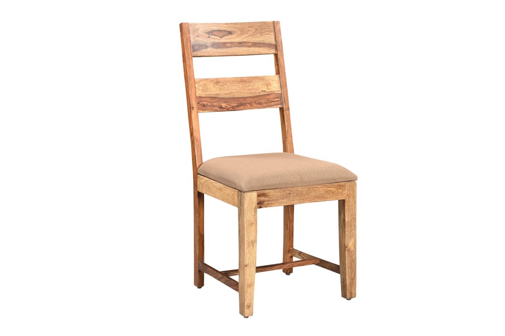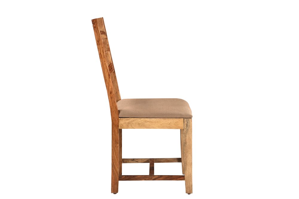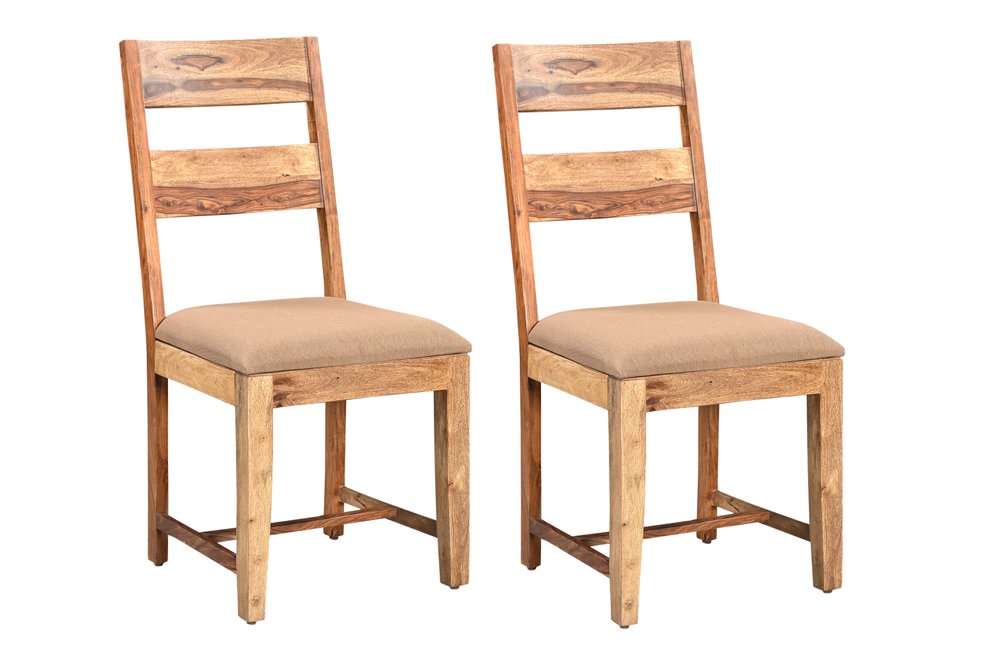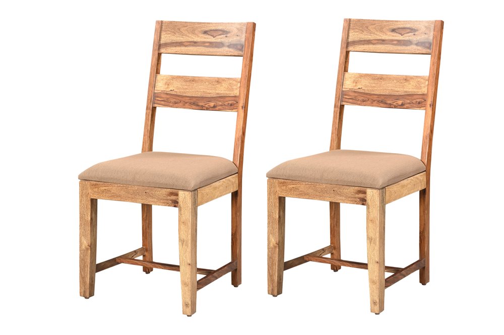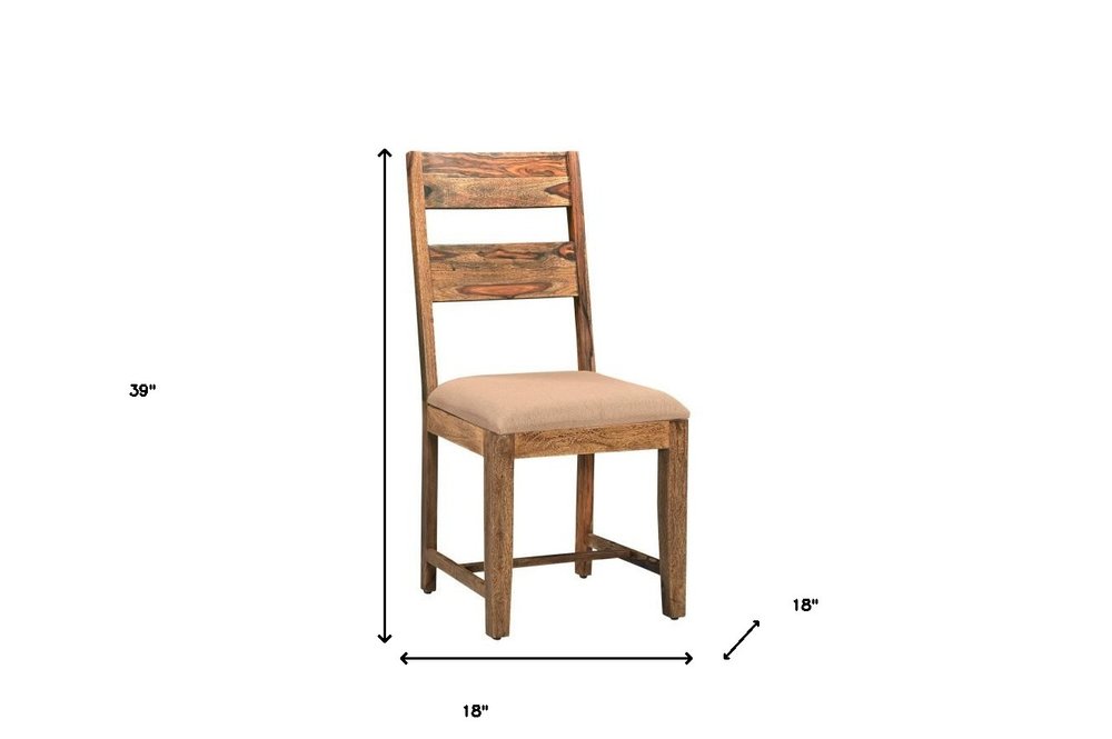 Bring this comfortable set of two brown fabric and wood ladder back dining side chairs to your table to enjoy long lasting quality time with your family and friends. Featuring a soft and cushiony upholstered seat, this side chair has no arms so it can easily fit around the table. Can also be used as an accent in living room or bedroom. Complete with ladder back, this chair not only looks good but is comfortable. Dining chairs are a great way to compliment your kitchen or dining room but can also be used in the foyer, hallway, or any room you might need extra seating. 39-inch h x 18-inch w x 18-inch d.