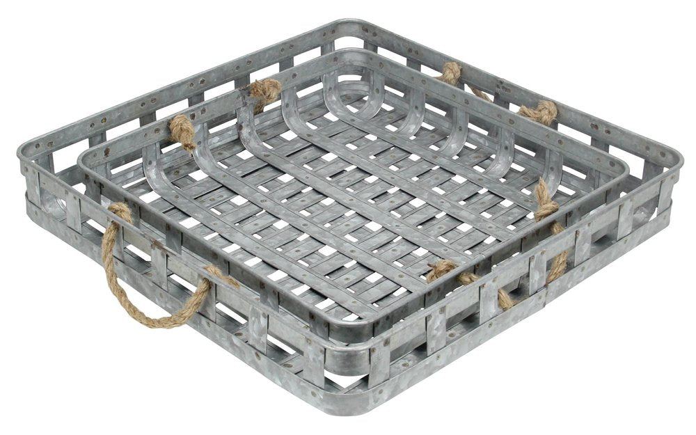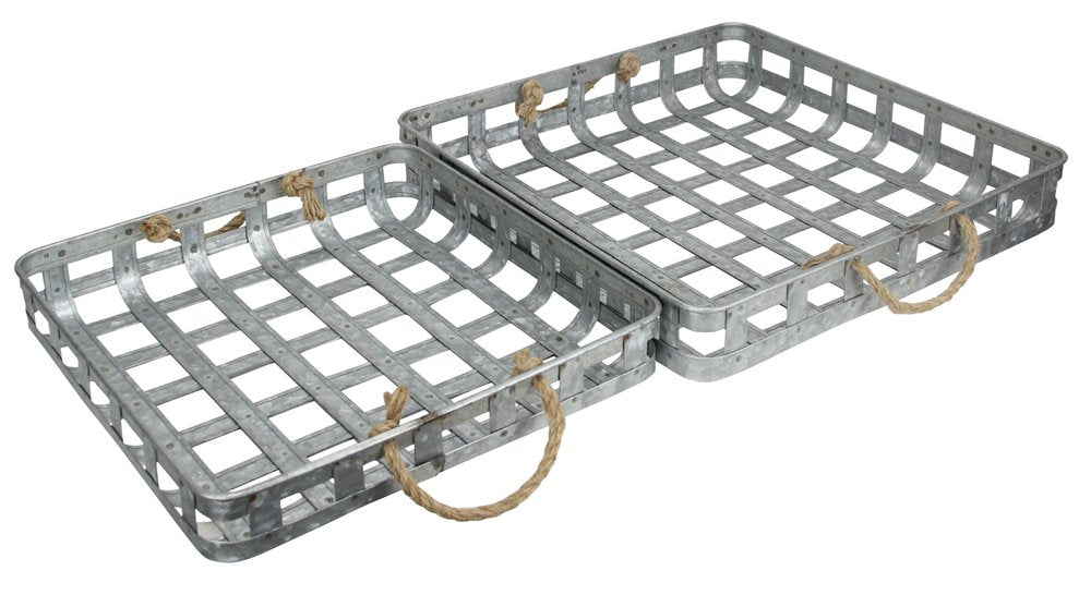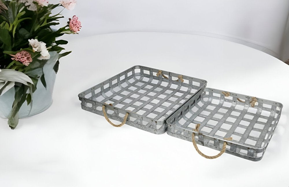 Renueva tu espacio con este práctico y atractivo juego de dos bandejas rectangulares de metal gris, hechas a mano y con asas. Fabricadas en metal resistente y duradero, estas bandejas rectangulares son tan versátiles que se adaptan a una variedad de paletas de colores y estilos. Cuentan con asas para un transporte rápido y fácil. Su acabado es apto para alimentos. Cada juego incluye dos piezas que se pueden usar por separado o juntas. 7,6 cm de alto x 43,2 cm de ancho x 43,2 cm de profundidad.