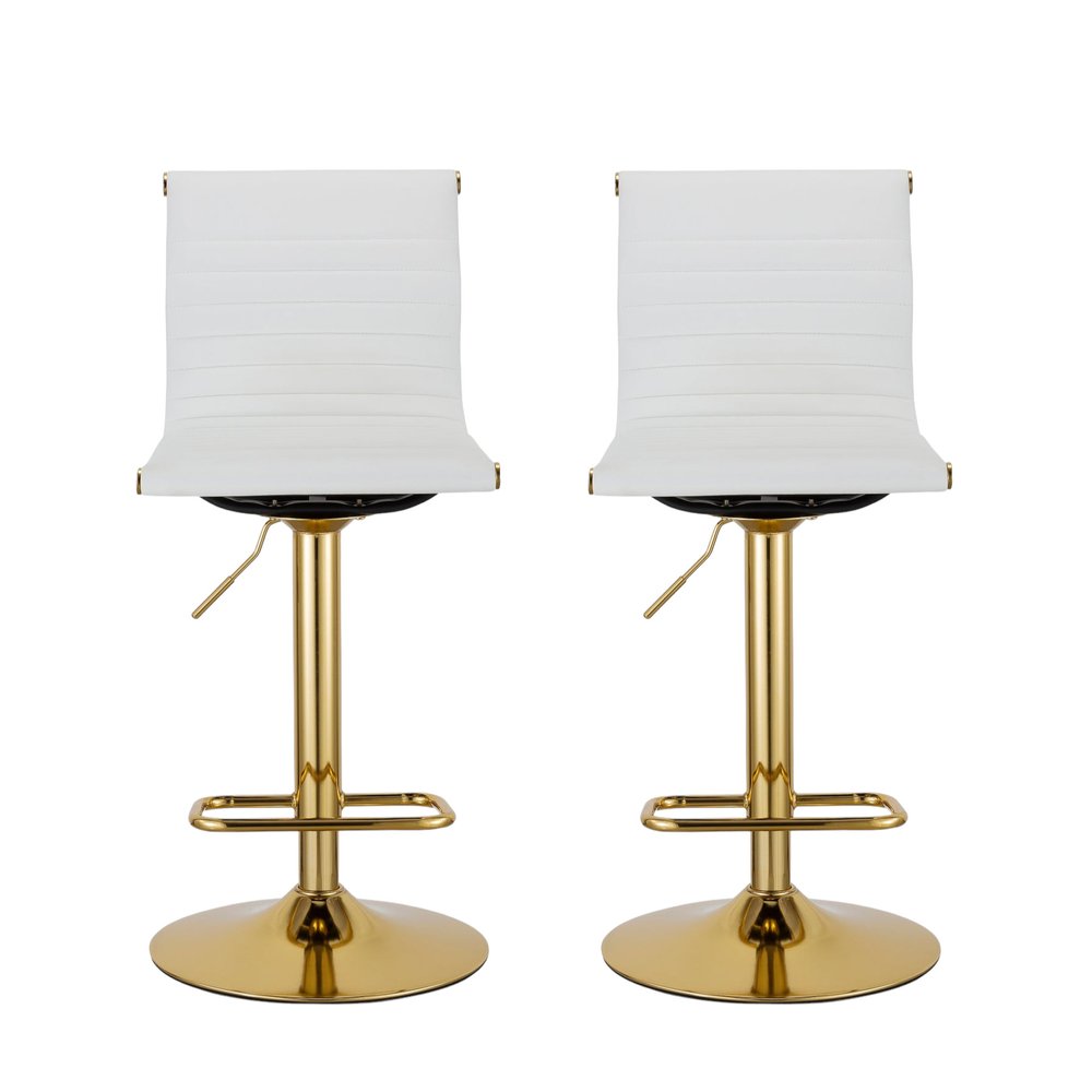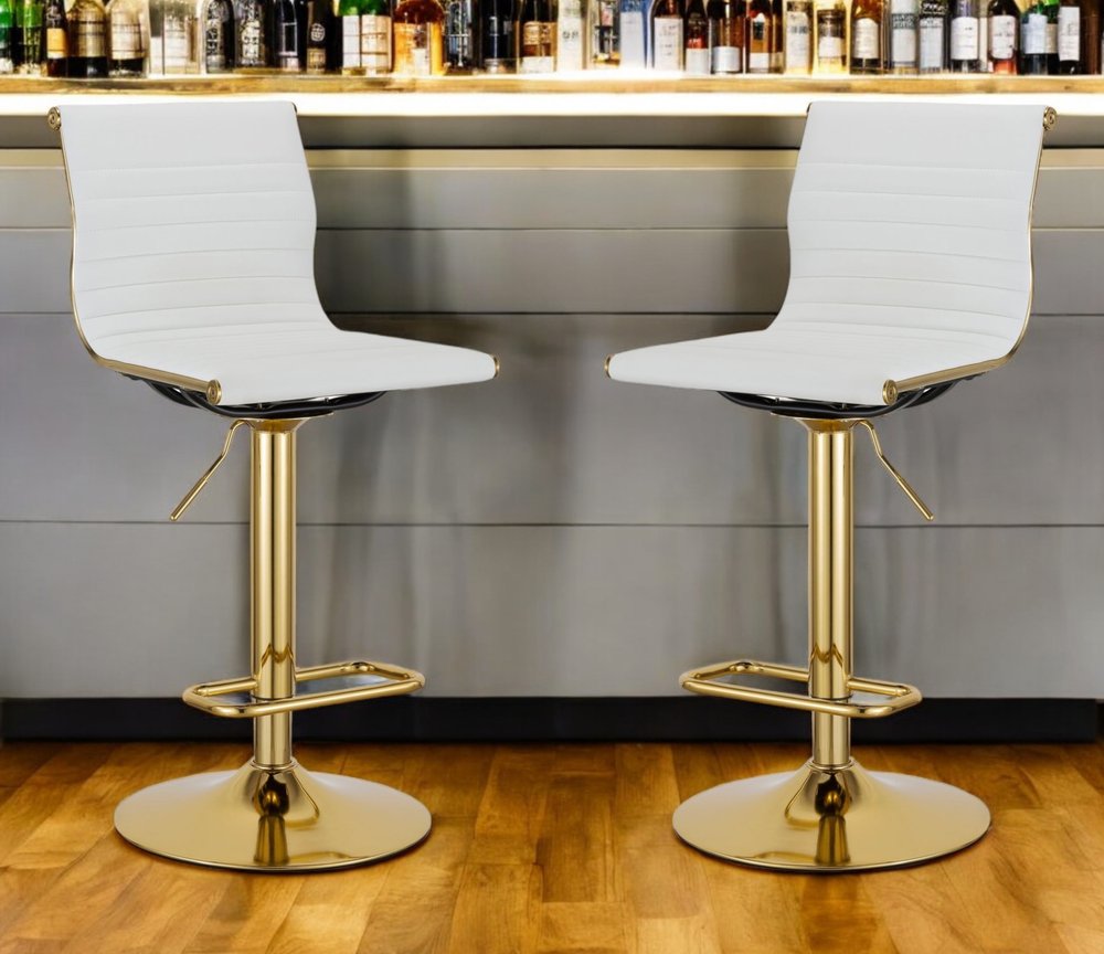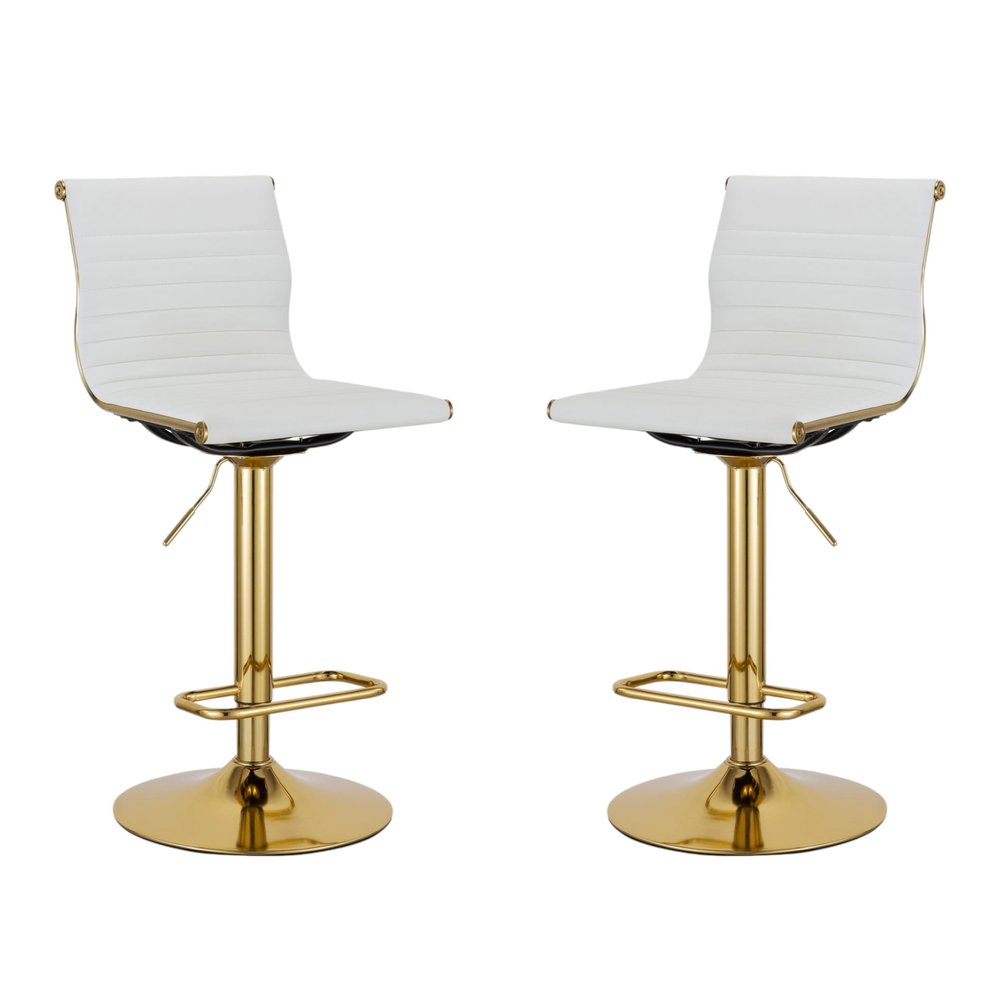 Set of Two White and Gold Faux Leather and Metal Low Back Adjustable Height Bar Chairs